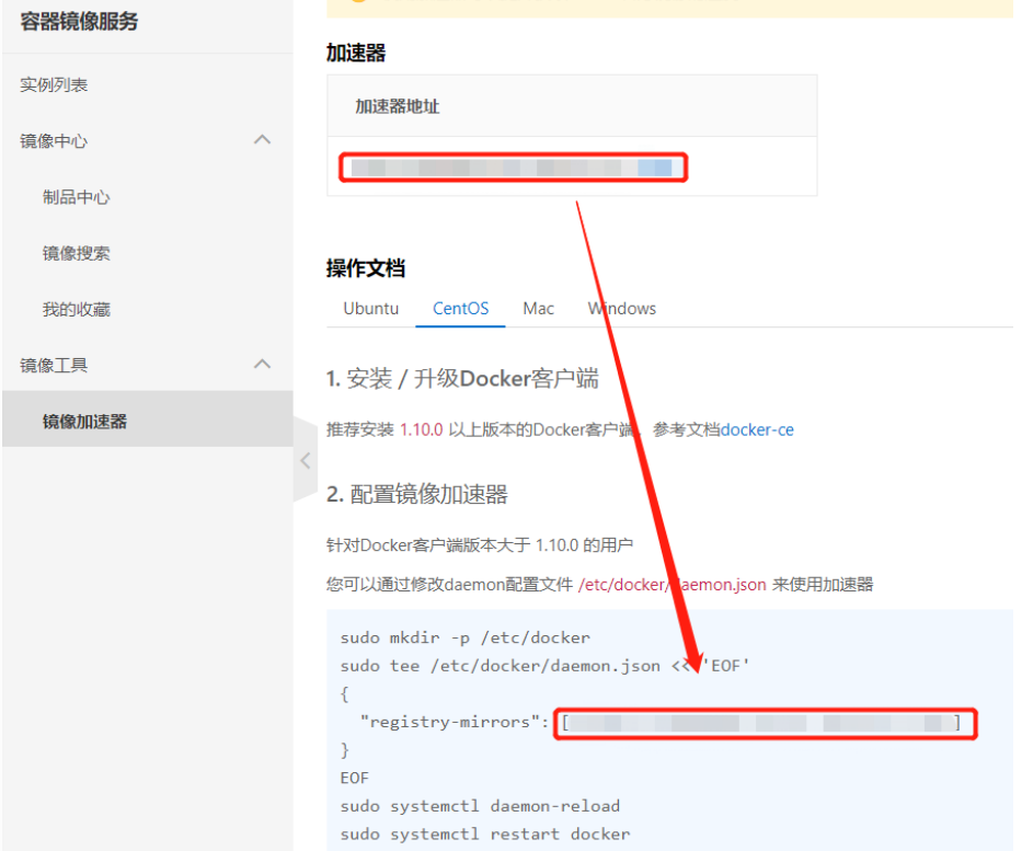 点击【产品】>【容器与中间键】>【容器镜像服务ACR】>【管理控制台】>【镜像工具】>【镜像加速器】>【点击centos】可以查看到配置用法