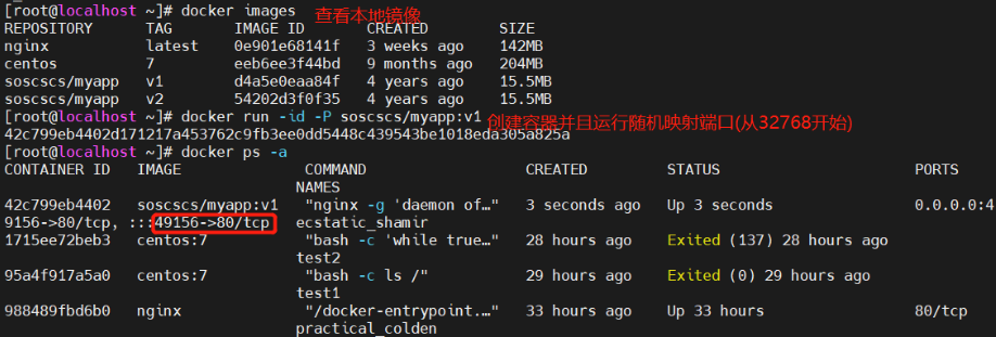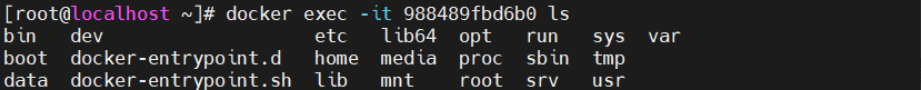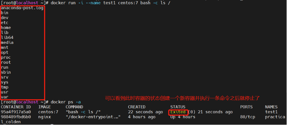 格式:docker run -i --name 容器名称 centos:7 bash -c ls /