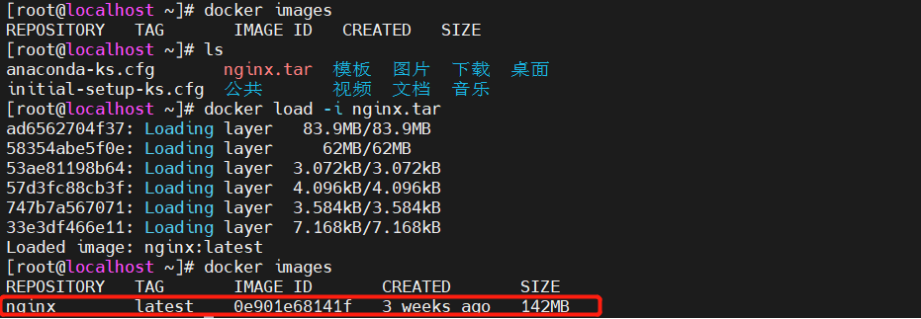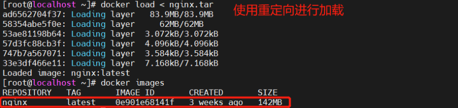 docker images方法二:docker rmi nginxdocker load < nginx.tar #使用重定向输入的方式进行加载