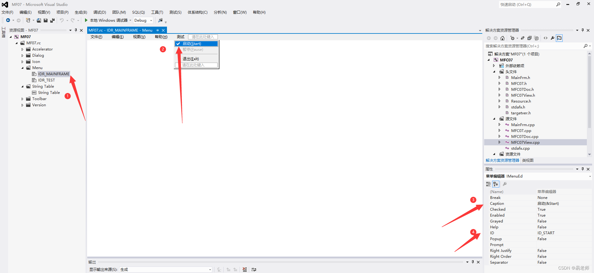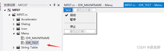 单文档窗口可以设置默认的主菜单,在资源视图中可以进行修改: