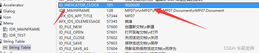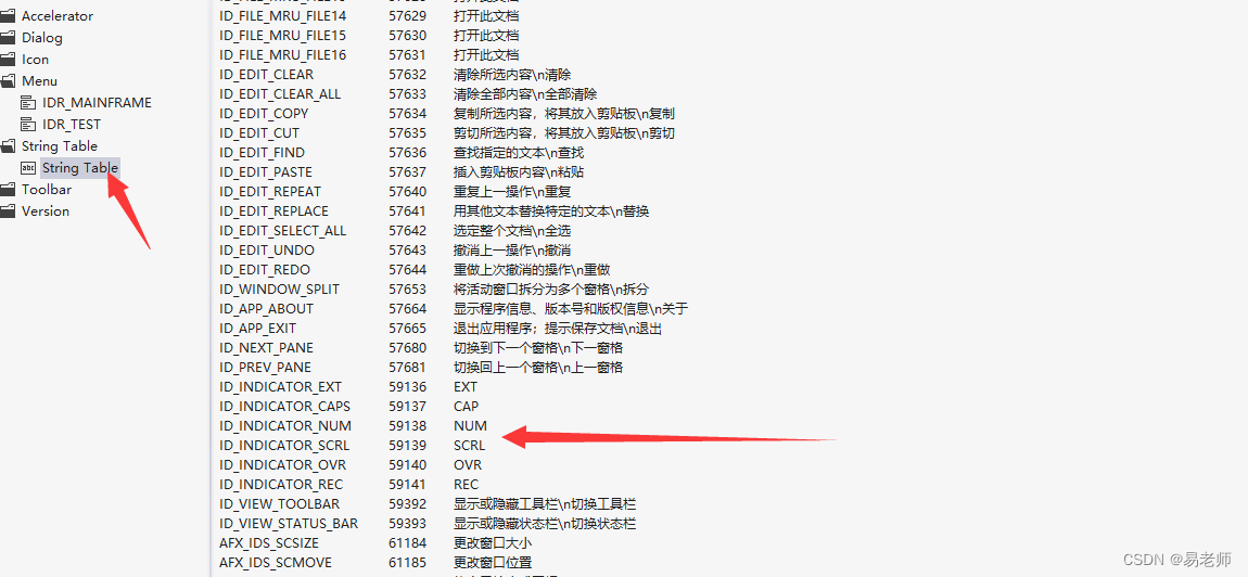 indicator数组提供了状态栏窗格的分配信息,它的第一项一般为ID_SEPARATOR,该ID对应的窗格用来显示命令提示信息,后三项都是字符串ID,可以在StringTable中找到: