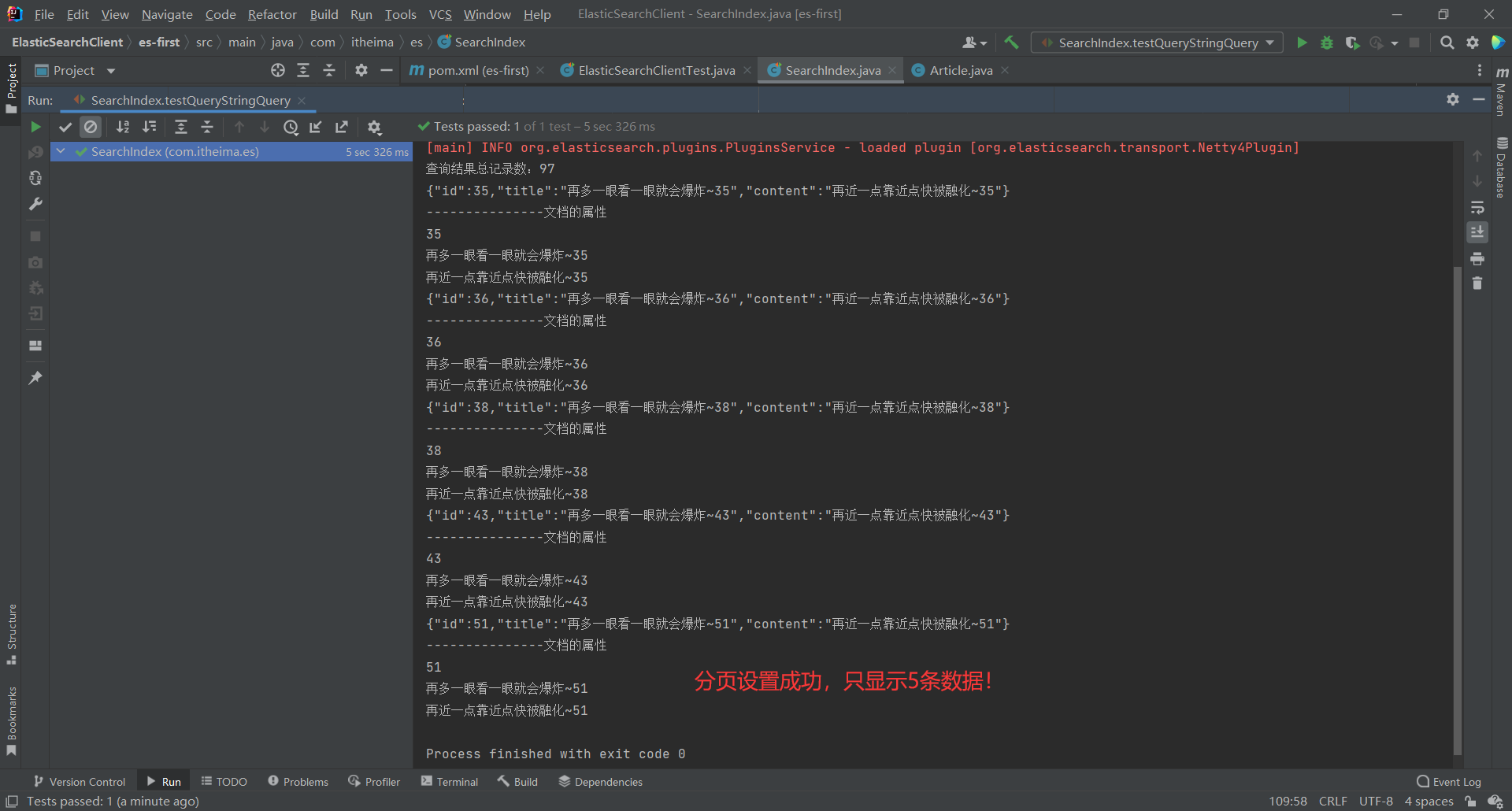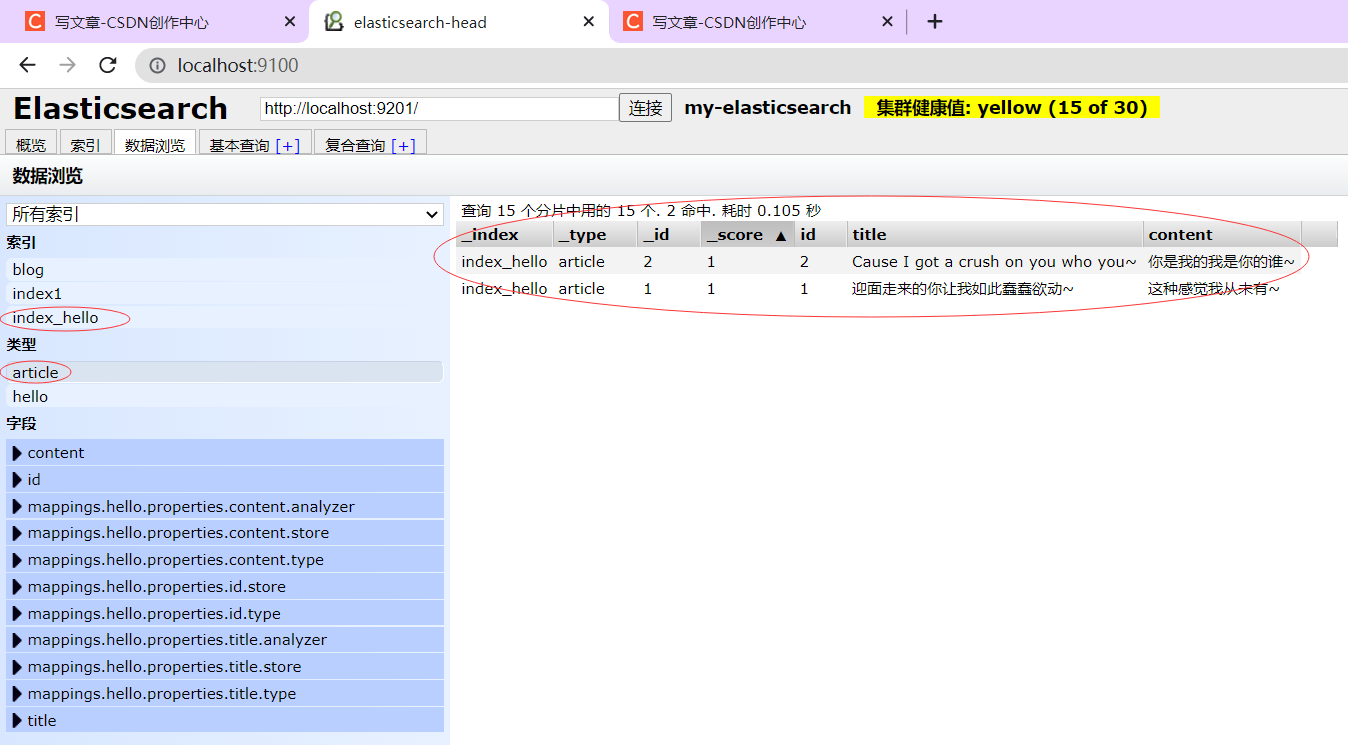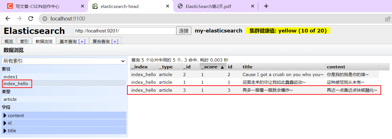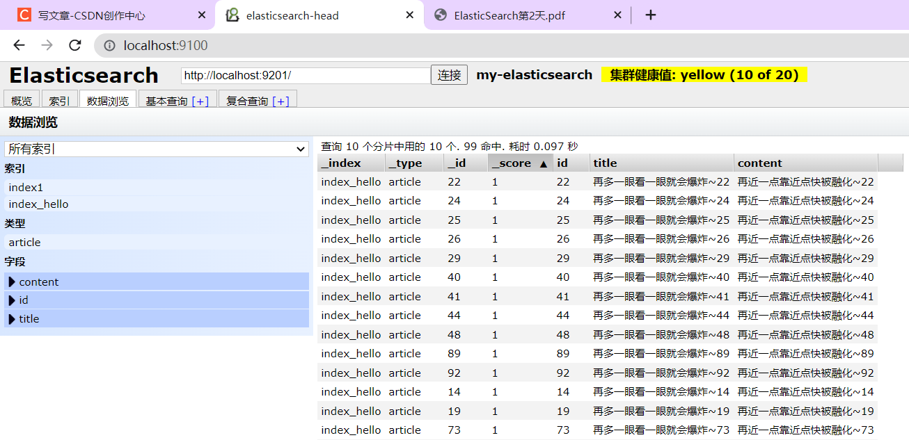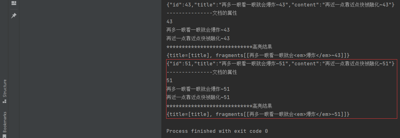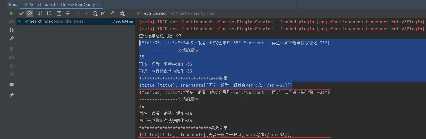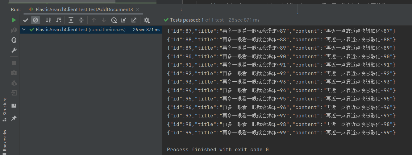 public void testAddDocument3() throws Exception {//批量添加数据for (int i = 4; i < 100; i++) {//创建一个Article对象Article article = new Article();//设置对象的属性article.setId(i);article.setTitle("再多一眼看一眼就会爆炸~" + i);article.setContent("再近一点靠近点快被融化~" + i);//把article对象转换成json格式的字符串ObjectMapper objectMapper = new ObjectMapper();String jsonDocument = objectMapper.writeValueAsString(article);System.out.println(jsonDocument);//使用client对象把文档写入索引库client.prepareIndex("index_hello", "article", i + "").setSource(jsonDocument, XContentType.JSON).get();}//关闭客户端client.close();