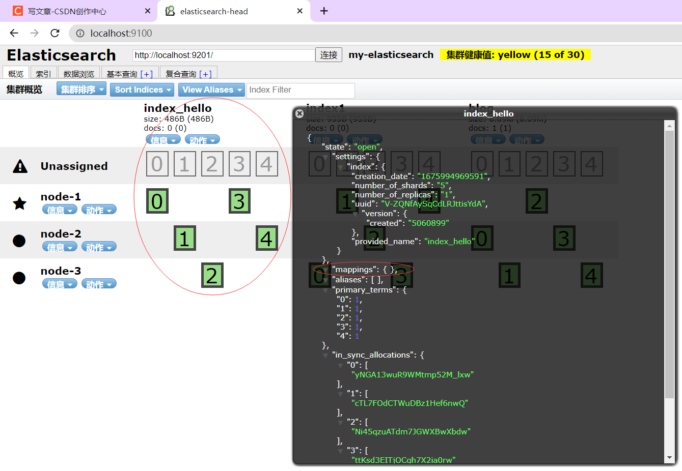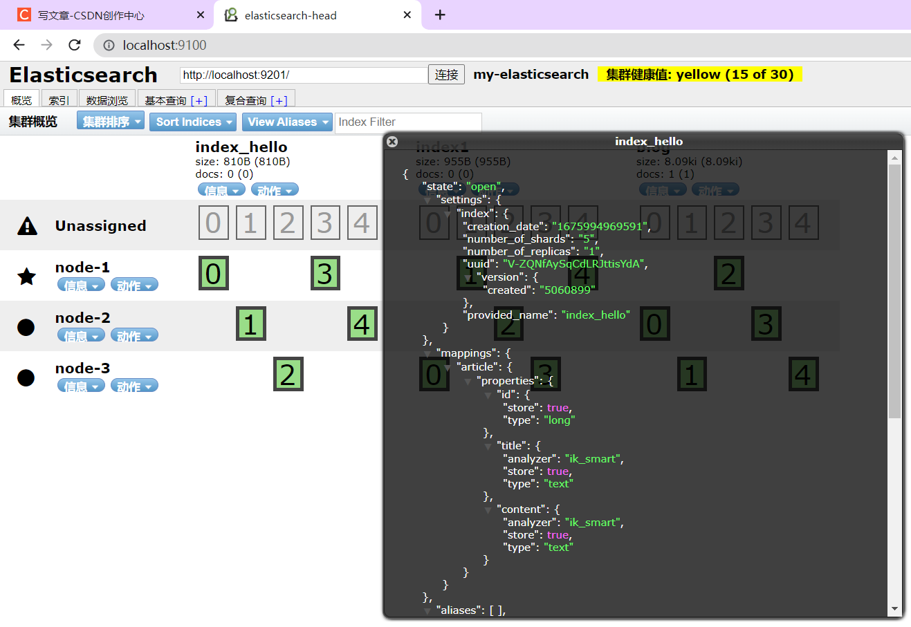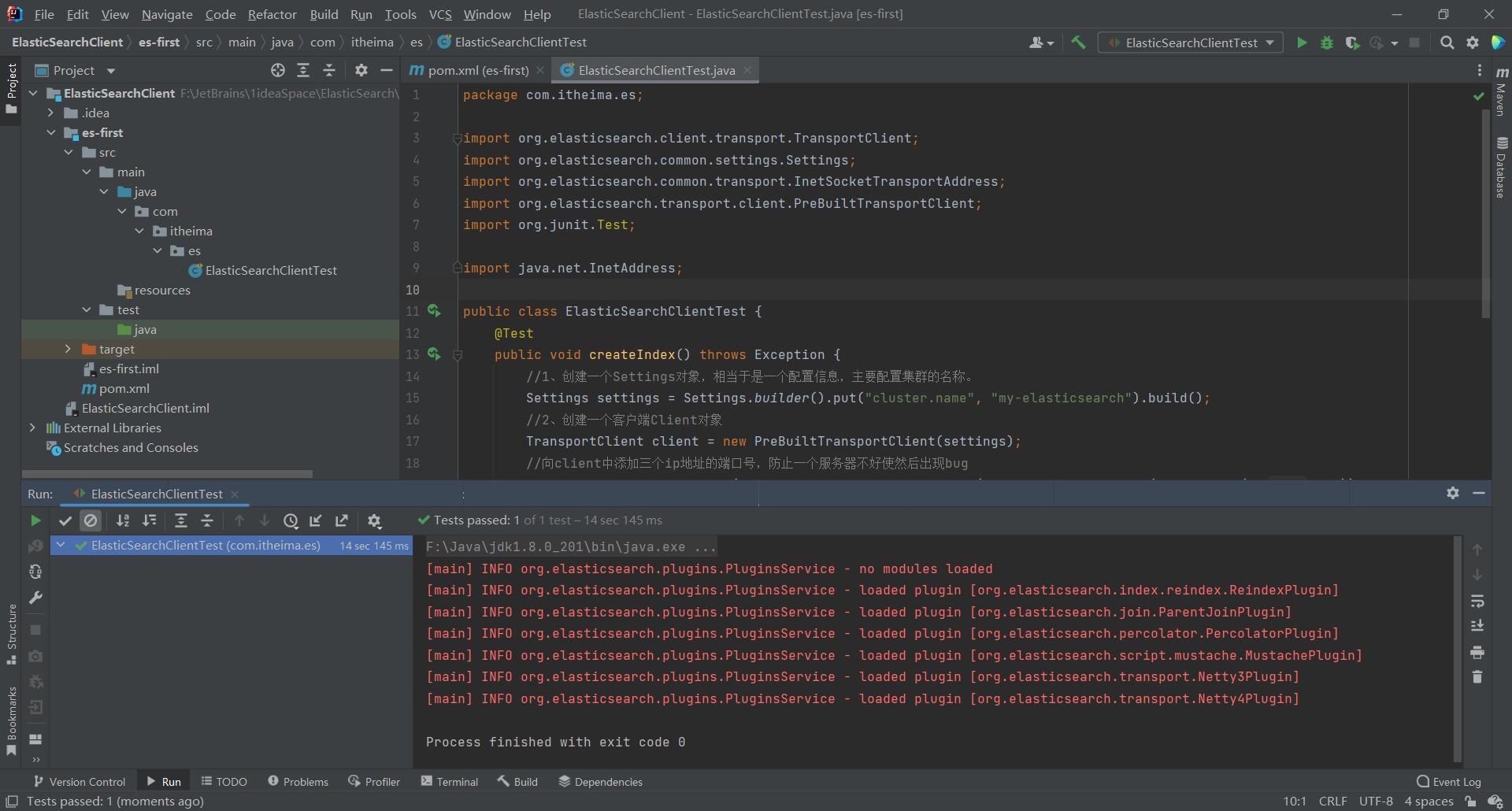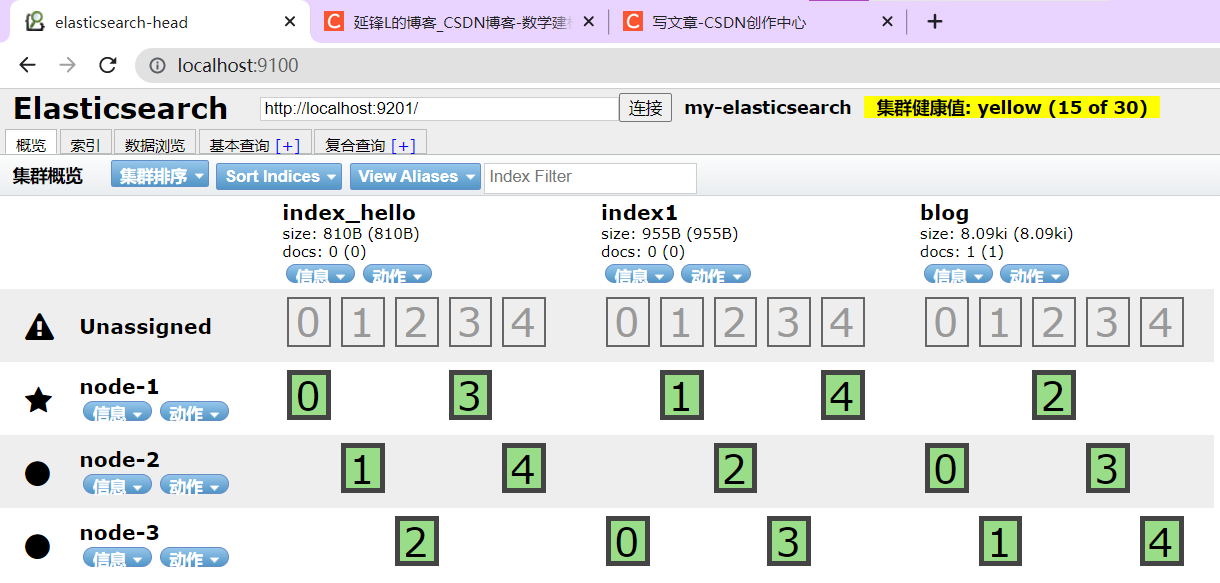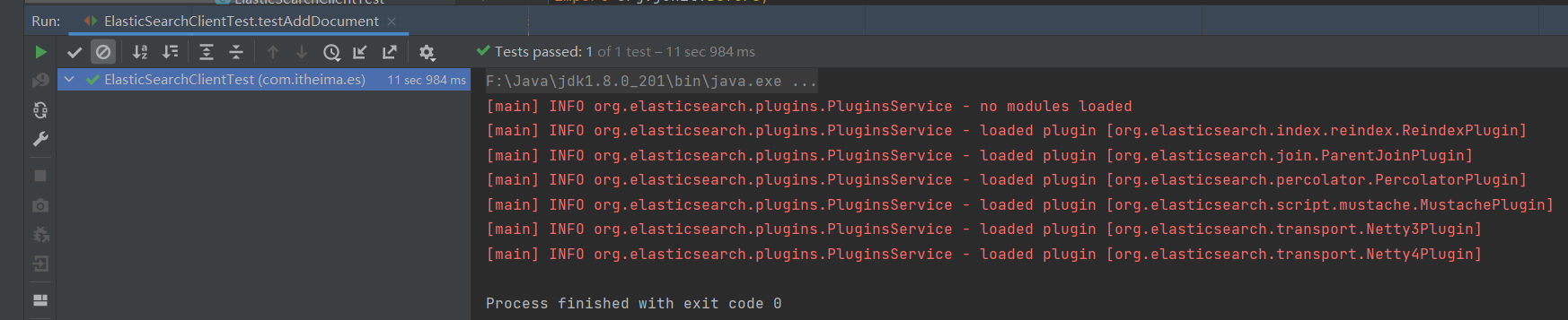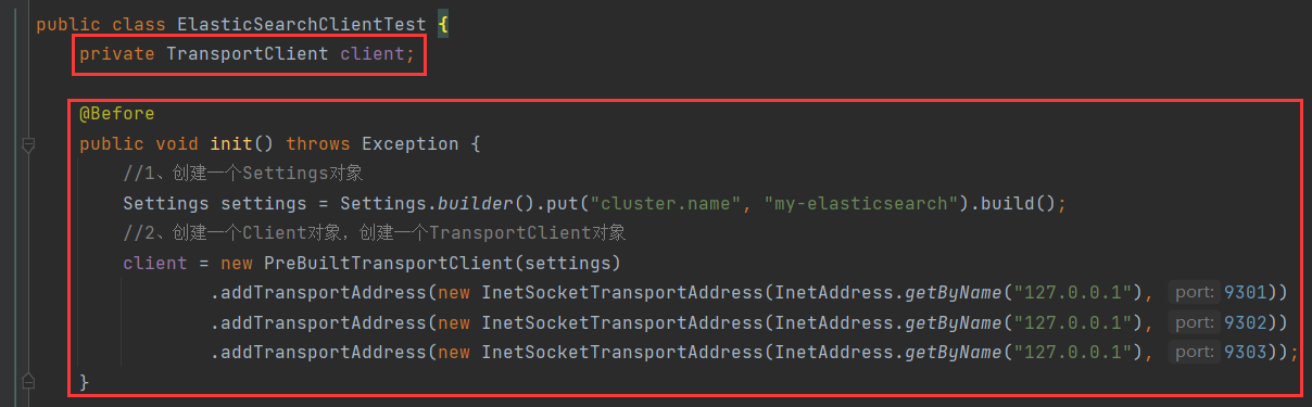 import org.junit.Test;import java.net.InetAddress;public class ElasticSearchClientTest {@Testpublic void createIndex() throws Exception {//1、创建一个Settings对象,相当于是一个配置信息,主要配置集群的名称。Settings settings = Settings.builder().put("cluster.name", "my-elasticsearch").build();//2、创建一个客户端Client对象TransportClient client = new PreBuiltTransportClient(settings);//向client中添加三个ip地址的端口号,防止一个服务器不好使然后出现bugclient.addTransportAddress(new InetSocketTransportAddress(InetAddress.getByName("127.0.0.1"), 9301));client.addTransportAddress(new InetSocketTransportAddress(InetAddress.getByName("127.0.0.1"), 9302));client.addTransportAddress(new InetSocketTransportAddress(InetAddress.getByName("127.0.0.1"), 9303));//3、使用client对象创建一个索引库client.admin().indices().prepareCreate("index_hello").get();//.get()执行操作//index_hello索引名称//4、关闭client对象client.close();}