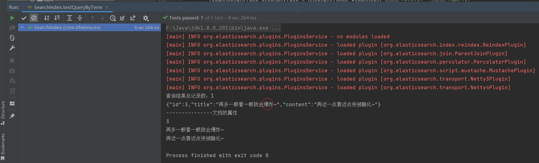 import java.util.Map;public class SearchIndex {private TransportClient client;@Beforepublic void init() throws Exception {//1、创建一个Settings对象Settings settings = Settings.builder().put("cluster.name", "my-elasticsearch").build();//2、创建一个Client对象,创建一个TransportClient对象client = new PreBuiltTransportClient(settings).addTransportAddress(new InetSocketTransportAddress(InetAddress.getByName("127.0.0.1"), 9301)).addTransportAddress(new InetSocketTransportAddress(InetAddress.getByName("127.0.0.1"), 9302)).addTransportAddress(new InetSocketTransportAddress(InetAddress.getByName("127.0.0.1"), 9303));}private void search(QueryBuilder queryBuilder) throws Exception {//3)使用client执行查询SearchResponse searchResponse = client.prepareSearch("index_hello").setTypes("article").setQuery(queryBuilder).get();//4)得到查询的结果SearchHits searchHits = searchResponse.getHits();//5)取查询结果的总记录数System.out.println("查询结果总记录数:" + searchHits.getTotalHits());//6)取查询结果列表Iterator iterator = searchHits.iterator();while (iterator.hasNext()) {SearchHit searchHit = iterator.next();//打印文档对象,以json格式输出System.out.println(searchHit.getSourceAsString());//取文档的属性System.out.println("---------------文档的属性");Map document = searchHit.getSource();System.out.println(document.get("id"));System.out.println(document.get("title"));System.out.println(document.get("content"));}//7)关闭clientclient.close();}@Testpublic void testSearchById() throws Exception {//1)创建一个client对象//public void init() throws Exception {}//2)创建一个查询对象,可以使用QueryBuilders工具类创建QueryBuilder对象QueryBuilder queryBuilder = QueryBuilders.idsQuery().addIds("1", "2");search(queryBuilder);}@Testpublic void testQueryByTerm() throws Exception {//创建一个QueryBuilder对象//参数1:要搜索的字段//参数2:要搜索的关键词TermQueryBuilder queryBuilder = QueryBuilders.termQuery("title", "爆炸");//执行查询search(queryBuilder);}