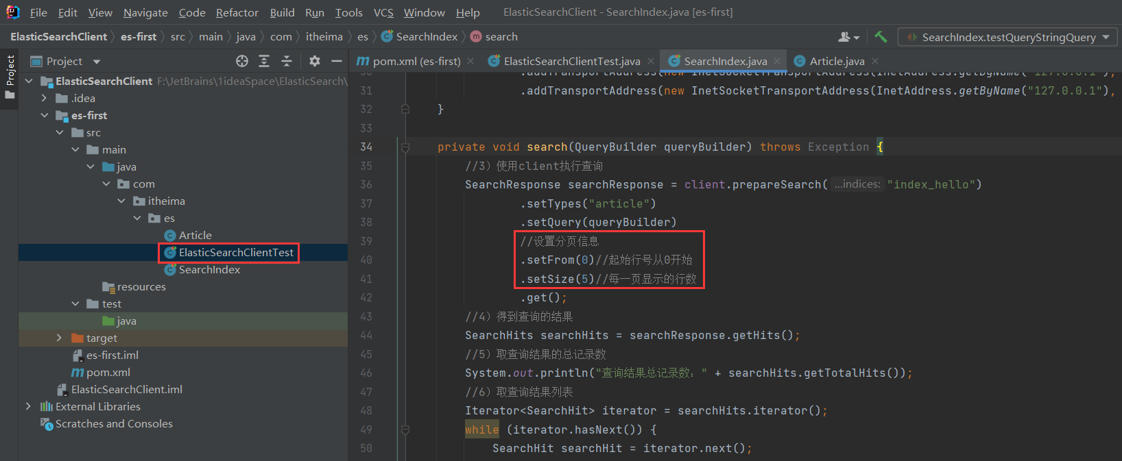 import java.util.Map;public class SearchIndex {private TransportClient client;@Beforepublic void init() throws Exception {//1、创建一个Settings对象Settings settings = Settings.builder().put("cluster.name", "my-elasticsearch").build();//2、创建一个Client对象,创建一个TransportClient对象client = new PreBuiltTransportClient(settings).addTransportAddress(new InetSocketTransportAddress(InetAddress.getByName("127.0.0.1"), 9301)).addTransportAddress(new InetSocketTransportAddress(InetAddress.getByName("127.0.0.1"), 9302)).addTransportAddress(new InetSocketTransportAddress(InetAddress.getByName("127.0.0.1"), 9303));}private void search(QueryBuilder queryBuilder) throws Exception {//3)使用client执行查询SearchResponse searchResponse = client.prepareSearch("index_hello").setTypes("article").setQuery(queryBuilder).get();//4)得到查询的结果SearchHits searchHits = searchResponse.getHits();//5)取查询结果的总记录数System.out.println("查询结果总记录数:" + searchHits.getTotalHits());//6)取查询结果列表Iterator iterator = searchHits.iterator();while (iterator.hasNext()) {SearchHit searchHit = iterator.next();//打印文档对象,以json格式输出System.out.println(searchHit.getSourceAsString());//取文档的属性System.out.println("---------------文档的属性");Map document = searchHit.getSource();System.out.println(document.get("id"));System.out.println(document.get("title"));System.out.println(document.get("content"));}//7)关闭clientclient.close();}private void search(QueryBuilder queryBuilder, String highLightField) throws Exception {HighlightBuilder highlightBuilder = new HighlightBuilder();highlightBuilder.field(highLightField);//高亮显示的字段highlightBuilder.preTags("");//前缀highlightBuilder.postTags("");//后缀//3)使用client执行查询SearchResponse searchResponse = client.prepareSearch("index_hello").setTypes("article").setQuery(queryBuilder)//设置分页信息.setFrom(0)//起始行号从0开始.setSize(5)//每一页显示的行数//设置高亮信息.highlighter(highlightBuilder).get();//4)得到查询的结果SearchHits searchHits = searchResponse.getHits();//5)取查询结果的总记录数System.out.println("查询结果总记录数:" + searchHits.getTotalHits());//6)取查询结果列表Iterator iterator = searchHits.iterator();while (iterator.hasNext()) {SearchHit searchHit = iterator.next();//打印文档对象,以json格式输出System.out.println(searchHit.getSourceAsString());//取文档的属性System.out.println("---------------文档的属性");Map document = searchHit.getSource();System.out.println(document.get("id"));System.out.println(document.get("title"));System.out.println(document.get("content"));System.out.println("****************************高亮结果");Map highlightFields = searchHit.getHighlightFields();System.out.println(highlightFields);}//7)关闭clientclient.close();}@Testpublic void testSearchById() throws Exception {//1)创建一个client对象//public void init() throws Exception {}//2)创建一个查询对象,可以使用QueryBuilders工具类创建QueryBuilder对象QueryBuilder queryBuilder = QueryBuilders.idsQuery().addIds("1", "2");search(queryBuilder);/*//3)使用client执行查询SearchResponse searchResponse = client.prepareSearch("index_hello").setTypes("article").setQuery(queryBuilder).get();//4)得到查询的结果SearchHits searchHits = searchResponse.getHits();//5)取查询结果的总记录数System.out.println("查询结果总记录数:" + searchHits.getTotalHits());//6)取查询结果列表Iterator iterator = searchHits.iterator();while (iterator.hasNext()) {SearchHit searchHit = iterator.next();//打印文档对象,以json格式输出System.out.println(searchHit.getSourceAsString());//取文档的属性System.out.println("---------------文档的属性");Map document = searchHit.getSource();System.out.println(document.get("id"));System.out.println(document.get("title"));System.out.println(document.get("content"));}//7)关闭clientclient.close();*/}@Testpublic void testQueryByTerm() throws Exception {//创建一个QueryBuilder对象//参数1:要搜索的字段//参数2:要搜索的关键词TermQueryBuilder queryBuilder = QueryBuilders.termQuery("title", "爆炸");//执行查询search(queryBuilder);}@Testpublic void testQueryStringQuery() throws Exception {//创建一个QueryBuilder对象QueryBuilder queryBuilder = QueryBuilders.queryStringQuery("爆炸").defaultField("title");//执行查询search(queryBuilder, "title");}