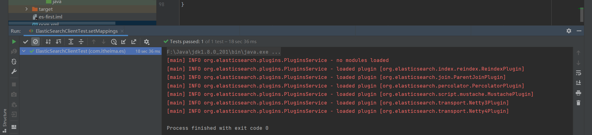 import org.junit.Test;import java.net.InetAddress;public class ElasticSearchClientTest {@Testpublic void createIndex() throws Exception {//1、创建一个Settings对象,相当于是一个配置信息,主要配置集群的名称。Settings settings = Settings.builder().put("cluster.name", "my-elasticsearch").build();//2、创建一个客户端Client对象TransportClient client = new PreBuiltTransportClient(settings);//向client中添加三个ip地址的端口号,防止一个服务器不好使然后出现bugclient.addTransportAddress(new InetSocketTransportAddress(InetAddress.getByName("127.0.0.1"), 9301));client.addTransportAddress(new InetSocketTransportAddress(InetAddress.getByName("127.0.0.1"), 9302));client.addTransportAddress(new InetSocketTransportAddress(InetAddress.getByName("127.0.0.1"), 9303));//3、使用client对象创建一个索引库client.admin().indices().prepareCreate("index_hello").get();//index_hello索引名称、get()执行操作//4、关闭client对象client.close();}@Testpublic void setMappings() throws Exception {//1、创建一个Settings对象Settings settings = Settings.builder().put("cluster.name", "my-elasticsearch").build();//2、创建一个Client对象,创建一个TransportClient对象TransportClient client = new PreBuiltTransportClient(settings).addTransportAddress(new InetSocketTransportAddress(InetAddress.getByName("127.0.0.1"), 9301)).addTransportAddress(new InetSocketTransportAddress(InetAddress.getByName("127.0.0.1"), 9302)).addTransportAddress(new InetSocketTransportAddress(InetAddress.getByName("127.0.0.1"), 9303));//3、创建一个mapping信息,应该是一个json数据,可以是字符串,也可以是XContextBuilder对象/*{"article": {type名称,表名:文章"properties": {"id": {//字段"type": "long","store": true// "index": "not_analyzed"},"title": {"type": "text","store": true,"index": true,"analyzer": "ik_smart"//ik_max_word、standard},"content": {"type": "text","store": true,"index": true,//analyzed"analyzer": "ik_smart"//ik_max_word、standard}}}}*/XContentBuilder builder = XContentFactory.jsonBuilder().startObject().startObject("article")//type名称.startObject("properties").startObject("id").field("type", "long").field("store", true).endObject().startObject("title").field("type", "text").field("store", true).field("analyzer", "ik_smart").endObject().startObject("content").field("type", "text").field("store", true).field("analyzer", "ik_smart").endObject().endObject().endObject().endObject();//4、使用client向es服务器发送mapping信息,使用client把mapping信息设置到索引库中client.admin().indices().preparePutMapping("index_hello")//设置要做映射的索引,设置索引库名称.setType("article")//设置要做映射的type,设置type名称.setSource(builder)//mapping信息,可以是XContentBuilder对象也可以是json格式的字符串.get();//5、关闭client对象,关闭链接client.close();}