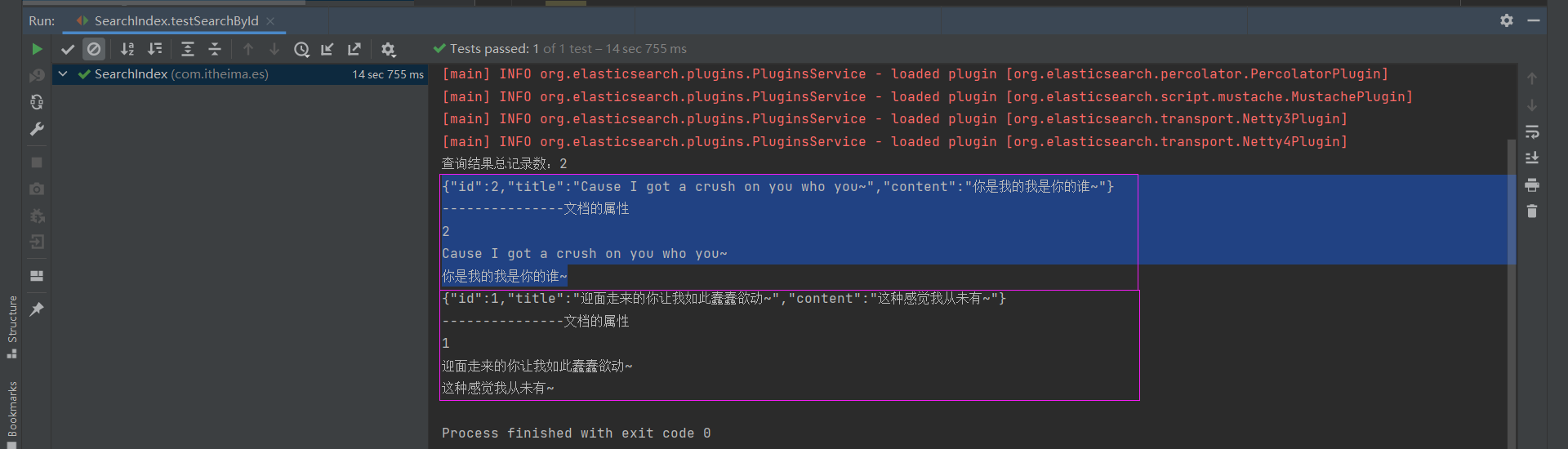 import java.util.Map;public class SearchIndex {private TransportClient client;@Beforepublic void init() throws Exception {//1、创建一个Settings对象Settings settings = Settings.builder().put("cluster.name", "my-elasticsearch").build();//2、创建一个Client对象,创建一个TransportClient对象client = new PreBuiltTransportClient(settings).addTransportAddress(new InetSocketTransportAddress(InetAddress.getByName("127.0.0.1"), 9301)).addTransportAddress(new InetSocketTransportAddress(InetAddress.getByName("127.0.0.1"), 9302)).addTransportAddress(new InetSocketTransportAddress(InetAddress.getByName("127.0.0.1"), 9303));}@Testpublic void testSearchById() throws Exception {//1)创建一个client对象//public void init() throws Exception {}//2)创建一个查询对象,可以使用QueryBuilders工具类创建QueryBuilder对象QueryBuilder queryBuilder = QueryBuilders.idsQuery().addIds("1", "2");//3)使用client执行查询SearchResponse searchResponse = client.prepareSearch("index_hello").setTypes("article").setQuery(queryBuilder).get();//4)得到查询的结果SearchHits searchHits = searchResponse.getHits();//5)取查询结果的总记录数System.out.println("查询结果总记录数:" + searchHits.getTotalHits());//6)取查询结果列表Iterator iterator = searchHits.iterator();while (iterator.hasNext()) {SearchHit searchHit = iterator.next();//打印文档对象,以json格式输出System.out.println(searchHit.getSourceAsString());//取文档的属性System.out.println("---------------文档的属性");Map document = searchHit.getSource();System.out.println(document.get("id"));System.out.println(document.get("title"));System.out.println(document.get("content"));}//7)关闭clientclient.close();}