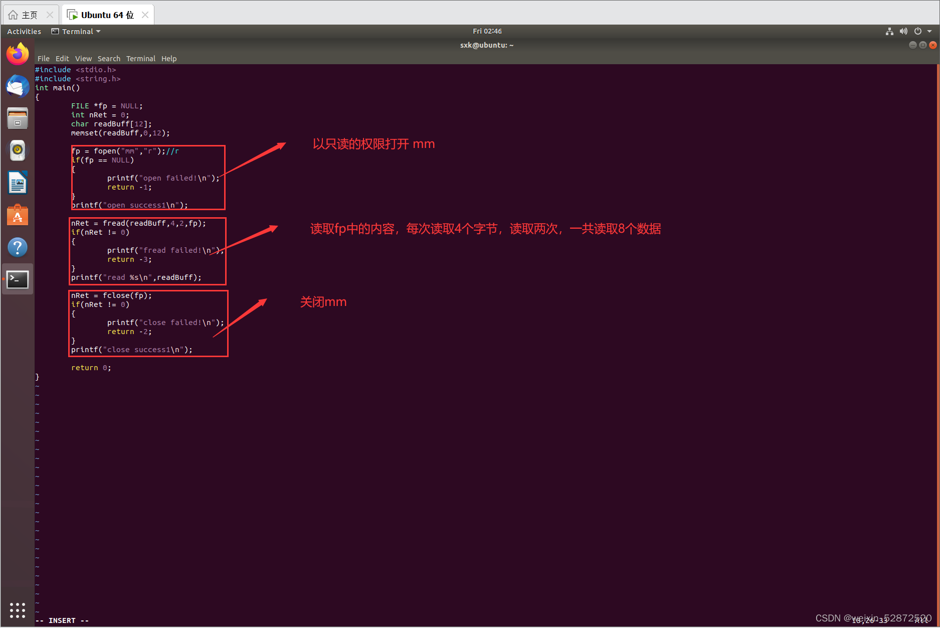 {FILE *fp = NULL;int nRet = 0;char readBuff[12];memset(readBuff,0,12);fp = fopen("mm","r");//rif(fp == NULL){printf("open failed!\n");return -1;}printf("open success1\n");nRet = fread(readBuff,4,2,fp);if(nRet <= 0){printf("fread failed!\n");return -3;}printf("read %s\n",readBuff);nRet = fclose(fp);if(nRet != 0){printf("close failed!\n");return -2;}printf("close success1\n");return 0;