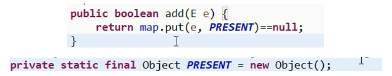 注:hashset中添加元素时,使用的时map中的put方法,键是元素,而值则是一个常量,是一个object对象,如下: