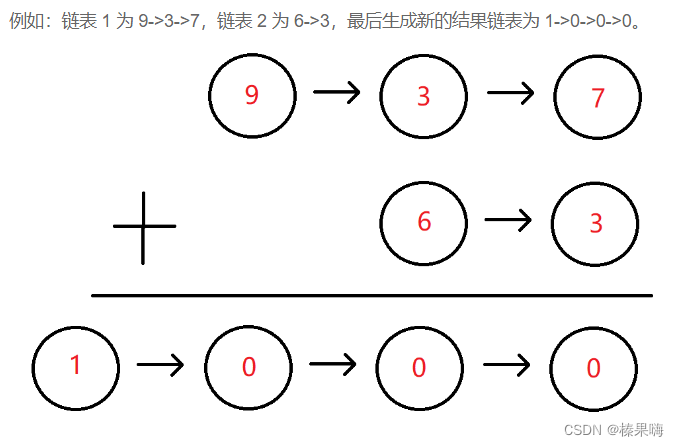public ListNode addTwoNumbers(ListNode l1, ListNode l2) {//新链表,有虚拟头节点ListNode newHead = new ListNode(-1);ListNode cur = newHead;//进位int temp = 0;while (l1!=null || l2!=null){int val = temp;if (l1!=null){val+=l1.val;l1=l1.next;}if (l2!=null){val+=l2.val;l2=l2.next;}temp = val/10;ListNode node = new ListNode(val%10);//尾插法建立链表cur.next=node;cur = cur.next;}//判断最后一位if (temp > 0){ListNode node = new ListNode(temp);cur.next= node;}//输出跳过虚拟头节点return newHead.next;}