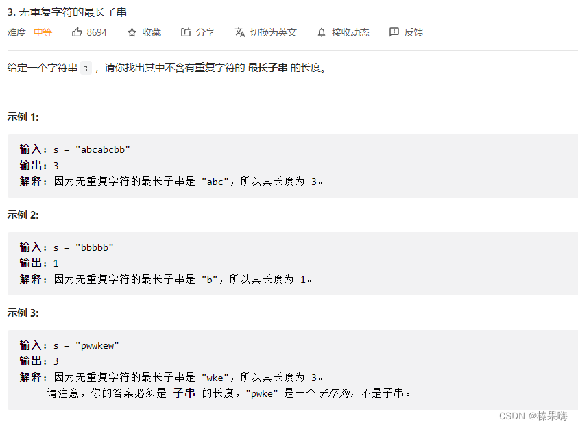 // write code hereif (s==null)return 0;int length = s.length();int max = 0;//hashmapHashMap hp = new HashMap<>();for (int i = 0,j = 0; i < length; i++) {if (hp.containsKey(s.charAt(i))){j = Math.max(j,hp.get(s.charAt(i))+1);}hp.put(s.charAt(i),i);max = Math.max(max,i-j+1);}return max;}