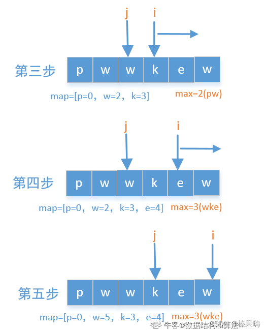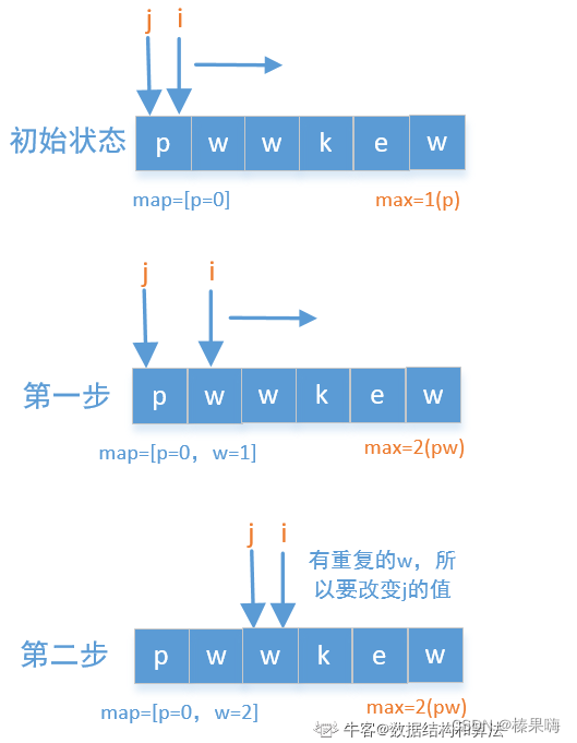 思路:我们使用两个指针,一个i一个j,最开始的时候i和j指向第一个元素,然后i往后移,把扫描过的元素都放到HashMap中,如果i扫描过的元素没有重复的就一直往后移,顺便记录一下最大值max,如果i扫描过的元素有重复的,就改变j的位置。我们就以p w w k e w,(图源自牛客大佬)