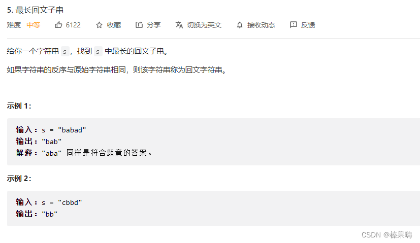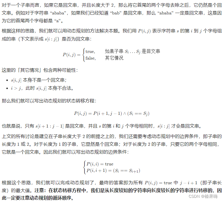 public static String longestPalindrome(String s) {int len = s.length();//如果字符串长度小于2,直接返回if (len < 2)return s;int max = 1;//起始位置int begin = 0;// dp[i][j] 表示 s[i..j] 是否是回文串boolean[][] dp = new boolean[len][len];//所有长度为1的子串一定是回文串for (int i = 0; i < len; i++) {dp[i][i] = true;}//将字符串转化为char数组char[] chars = s.toCharArray();//开始递推//L为子串的长度,从2开始枚举,因为子串长为1的已经为truefor (int L = 2; L <= len; L++) {//枚举左边界for (int i = 0; i < len; i++) {//右边界j = L+i-1;int j = L+i-1;//右边界越界则退出当前循环if (j >= len)break;//判断字符是否相等if (chars[i]!=chars[j]){dp[i][j] = false;}else {//如果子串长度<=2,即j-i<1if (j-i<=1)dp[i][j]=true;elsedp[i][j]=dp[i+1][j-1];}//只要 dp[i][L] == true 成立,就表示子串 s[i..L] 是回文,此时记录回文长度和起始位置if (dp[i][j] && j-i+1 > max){max = j-i+1;begin = i;}}}return s.substring(begin,begin+max);}