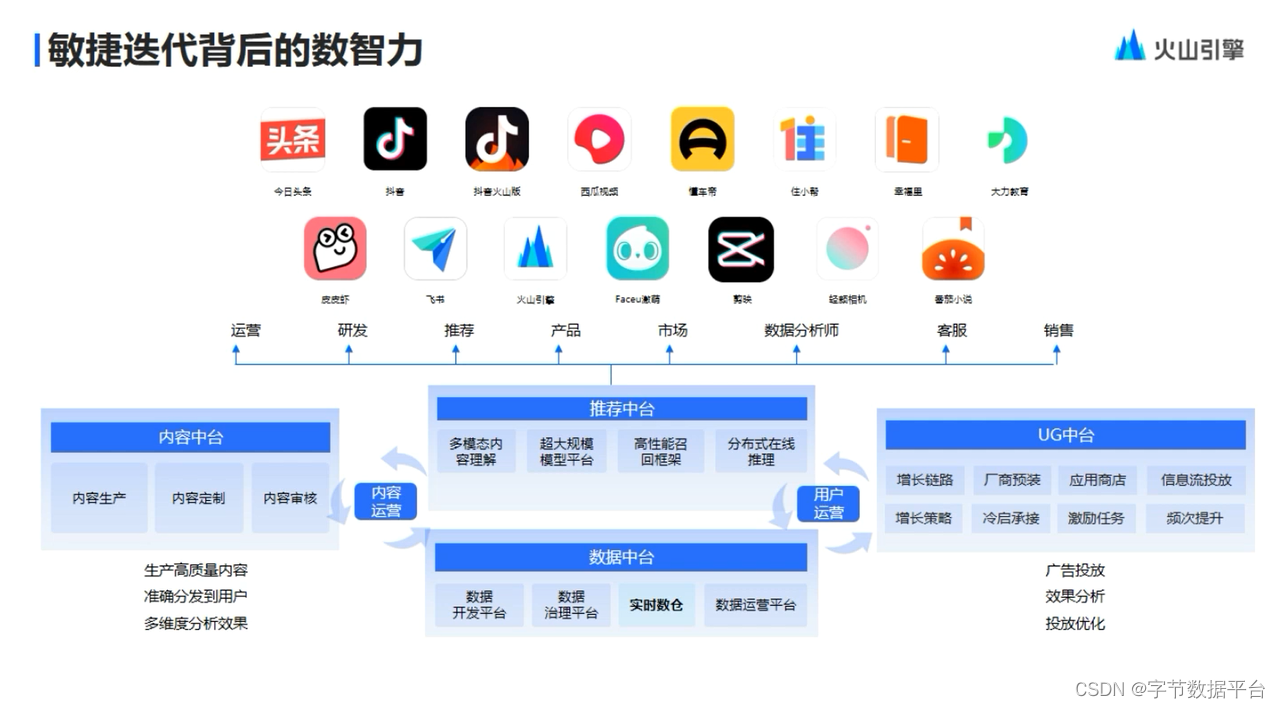 在字节跳动内部,不同的业务线及产品背后,其实是有着大量的中台在进行支持。以抖音和今日头条为例,从内容运营的角度,核心逻辑是怎么样把优质的内容生产出来,准确地分发到不同的用户并且及时的收到反馈,以此来不断形成一个迭代闭环。从用户运营的角度,是该怎么样去协助客户进行有效的广告投放,让他们能够精准地触达到目标用户。