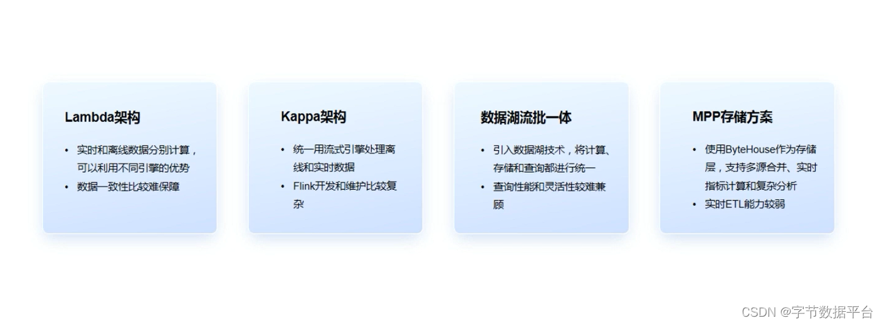 最后,MPP储存方案。使用MPP作为实时数据存储层,本质上其实也是Kappa架构的一个变形。基于Bytehouse对ClickHouse能力的升级,对数据链路的简化,以及开发效率的提升做了进一步的增强。