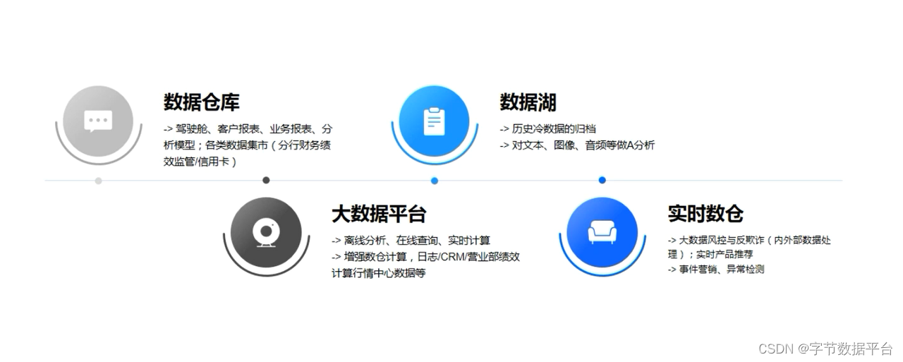 对于实时数仓,在金融行业它更多的像是数据湖和大数据平台的关系一样,是某一个细分场景的升级和迭代。比如说在金融行业里,像大数据风控、反欺诈或者说异常的监测场景,这些对于数仓的实时性能力要求更高,倒逼着对数据仓库做细分能力的增强。本质上来说,金融行业的实时数仓,是对于数仓和大数据能力里的一些实时性能力的抽象结合以及升级。