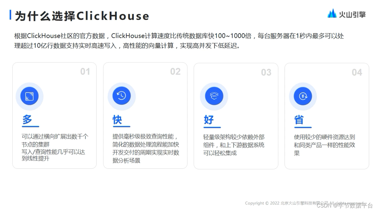 时效性、数据准确、开发运维成本低,这些跟ClickHouse的特性是高度相关的,也是ByteHouse团队选择ClickHouse的重要原因。