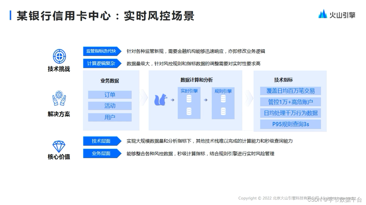 第二个案例,Bytehouse帮助一家银行的信用卡中心实现实时风控场景。大家应该都知道,风控对于金融机构来说是非常的重要的。传统的风控往往是通过一些批任务的处理,从各个系统中抽取风控数据,然后加工成一些风控的指标。
