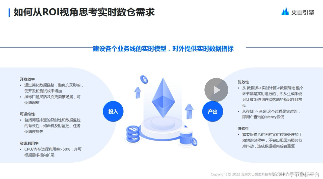 在技术层面上,其实就需要Bytehouse的一些能力来做支撑,比如说高数据的吞吐和写入,整个数据可见的超低时延,还有非常快速的数据查询能力,保证在数据写入和查询的服务下面高可用的支持。