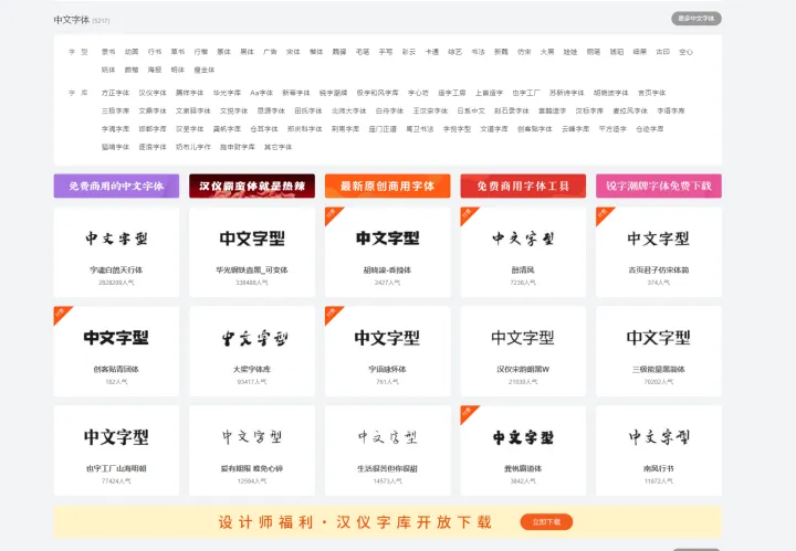 这是一个字体品牌设计师交流网站,收集了很多个人字体,免费商用的中文字体就有差不多500多款,还有很多英文字体可供选择。网站还有很多付费字体,大家可以根据需求去选择。
