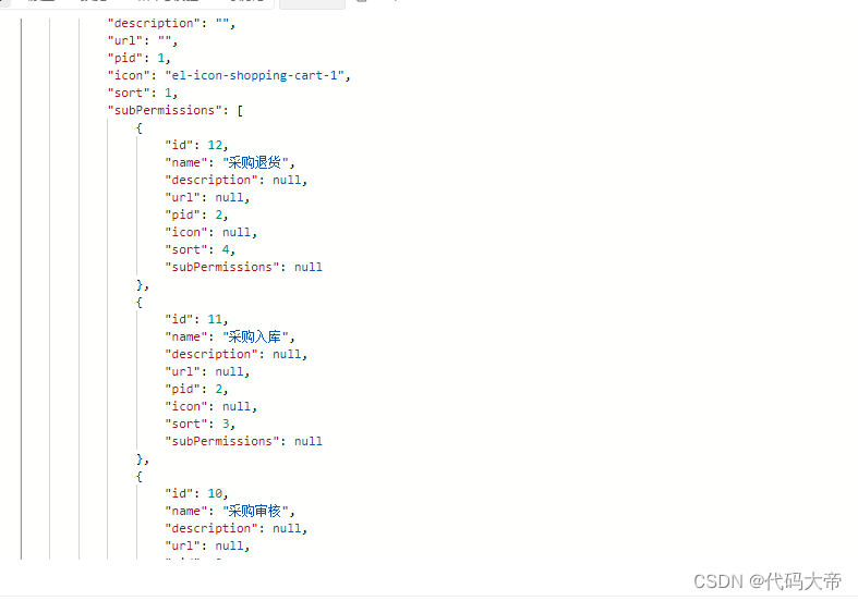 包含所有权限的集合的数据形式 ,将该集合传给前端,树形控件绑定该集合,就会以该方式显示到页面上。