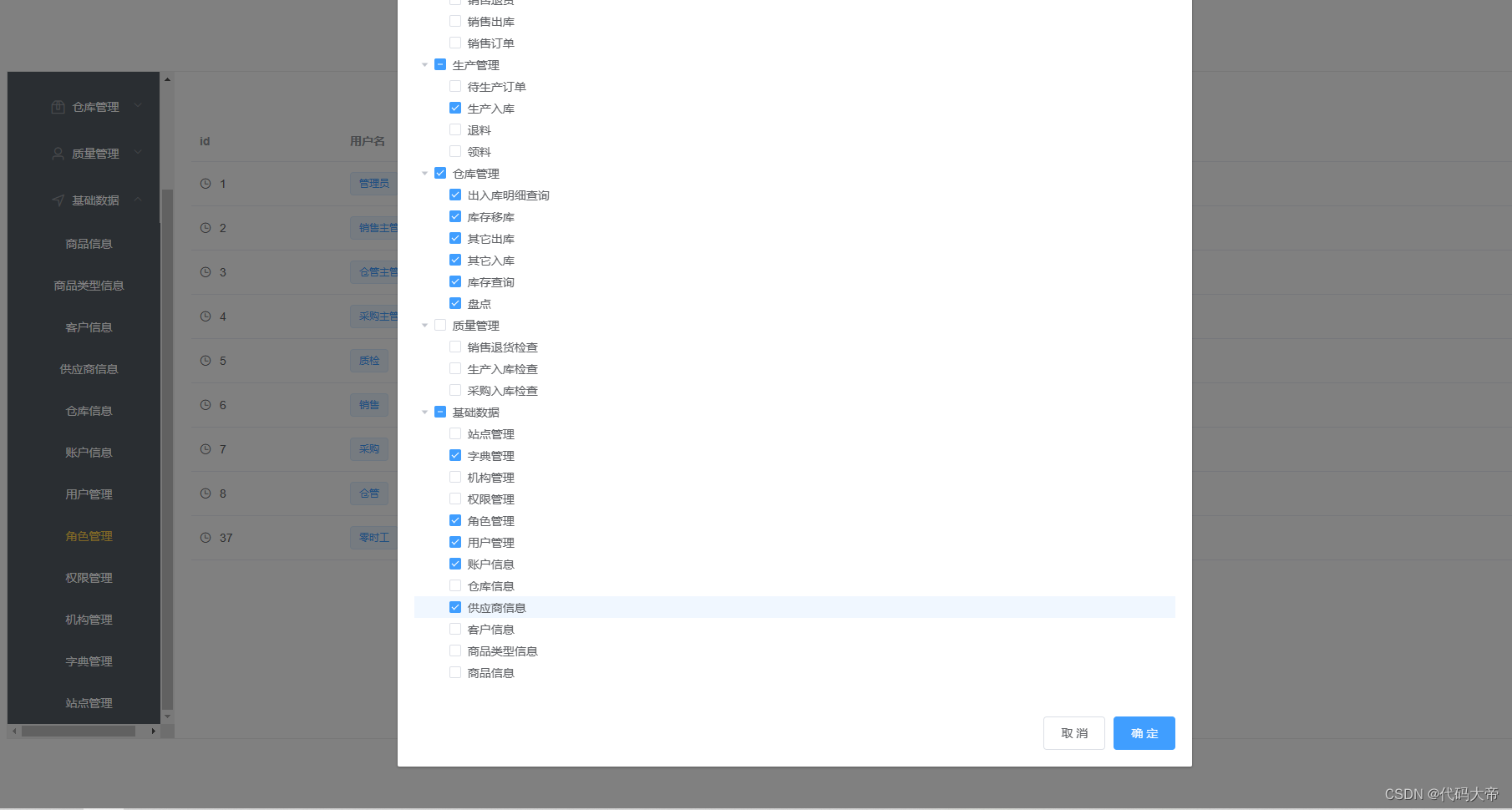 //点击修改角色权限 弹出树形图openTree(userId) {this.userId = userId;this.dialogTreeVisible = true//查询所有权限通过角色this.axios.get("http://localhost:8080/selectAllRole").then(result => {console.log("所有权限:" + result)if (result.data.status == "OK") {this.allRoles = result.data.data;//查询该角色拥有的权限this.axios.get("http://localhost:8080/select-role?userId=" + userId).then(result => {console.log("当前角色的权限" + result)if (result.data.status == "OK") {this.userRoles = result.data.data;//设置勾选效果this.$refs.tree.setCheckedNodes(this.userRoles);}})}})},//设置用户的角色setUserRoles() {console.log(this.$refs.tree.getCheckedKeys());//将数组转换成字符串let keys = this.$refs.tree.getCheckedKeys();let keyStr = ""for (let i = 0; i < keys.length; i++) {keyStr += keys[i] + ",";}keyStr.substr(0, keyStr.length - 1);//调用后台接口this.axios.post("http://localhost:8080/setRole", "userId=" + this.userId + "&roles=" + keyStr).then(result => {// if (result.request.status == 200) {this.$message(result.data);// }})this.dialogTreeVisible = false;},