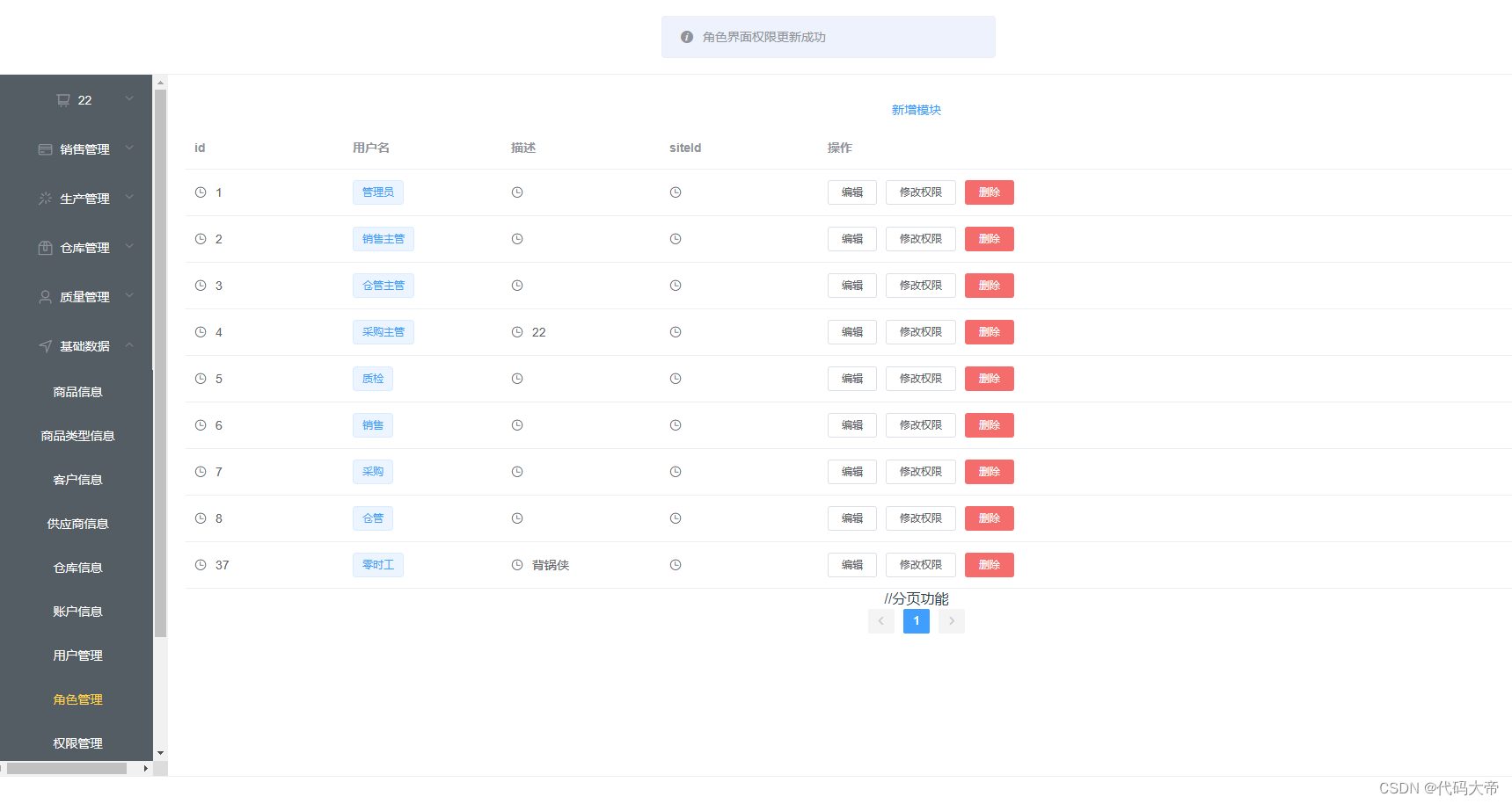 {{ scope.row.name }} {{ scope.row.description }}{{ scope.row.siteId }}编辑修改权限删除 //分页功能
