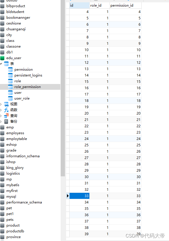 // boolean b = this.removeById(roleId);boolean b = this.remove(new QueryWrapper().lambda().eq(RolePermission::getRoleId, roleId));if (b) {//将权限依次赋值给rolePermissionString[] strings = permissions.split(",");for (String permissionId : strings) {RolePermission rolePermission = new RolePermission();//设置当前角色id 权限id id会自增rolePermission.setRoleId(roleId);rolePermission.setPermissionId(Long.valueOf(permissionId));rolePermissions.add(rolePermission);}//mybats-plus批量添加方法boolean b1 = this.saveBatch(rolePermissions);}}