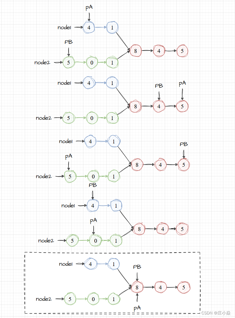 当链表 headA和 headB 都不为空时,创建两个指针pA 和pB,初始时分别指向两个链表的头节点 headA和 headB,然后将两个指针依次遍历两个链表的每个节点。具体做法如下: