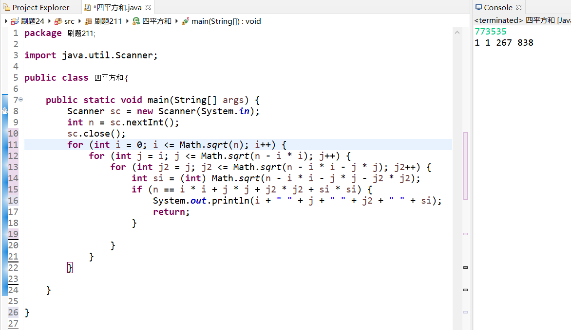 package 刷题211;import java.util.Scanner;public class 四平方和 {public static void main(String[] args) {Scanner sc = new Scanner(System.in);int n = sc.nextInt();sc.close();for (int i = 0; i <= Math.sqrt(n); i++) {for (int j = i; j <= Math.sqrt(n - i * i); j++) {for (int j2 = j; j2 <= Math.sqrt(n - i * i - j * j); j2++) {int si = (int) Math.sqrt(n - i * i - j * j - j2 * j2);if (n == i * i + j * j + j2 * j2 + si * si) {System.out.println(i + " " + j + " " + j2 + " " + si);return;}}}}}}