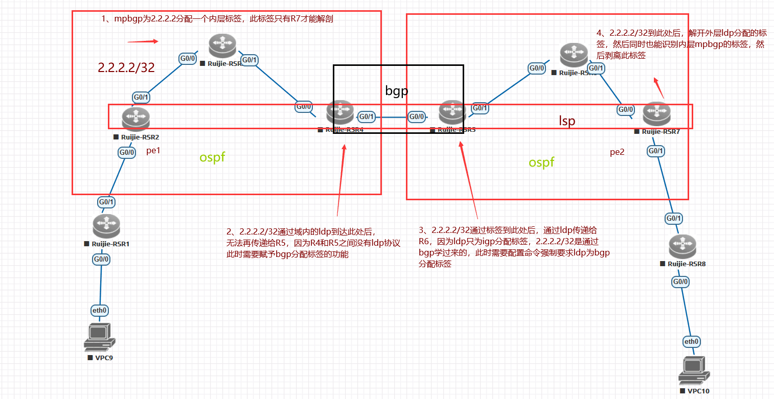 问题一:内层标签是pe1和pe2之间mpbgp二者建立的,只有他两个读懂,外层标签是mpls ldp产生的,但是在asbr之间进行传递的时候,出现了ldp标签的断层,因为mpls ldp只在自治系统内部才能形成lsp,即asbr之间无ldp协议。