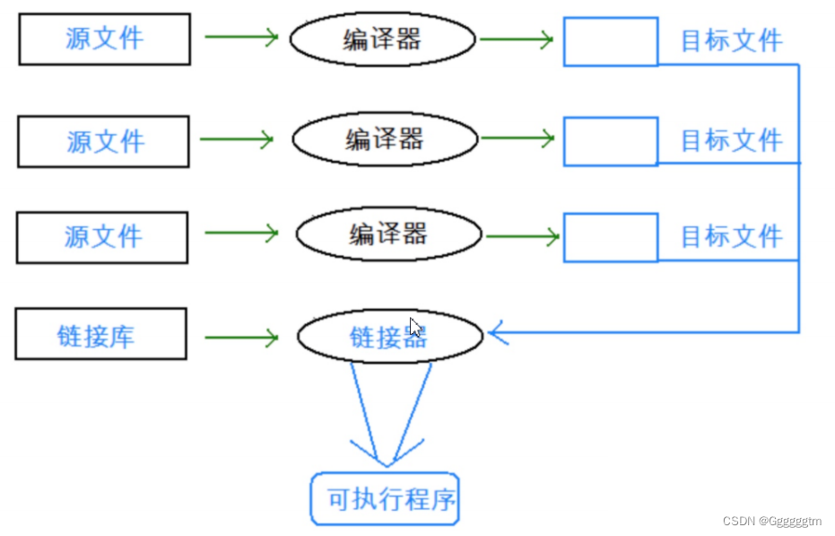 - 组成一个程序的每个源文件通过编译过程分别转换成目标代码(object code)。