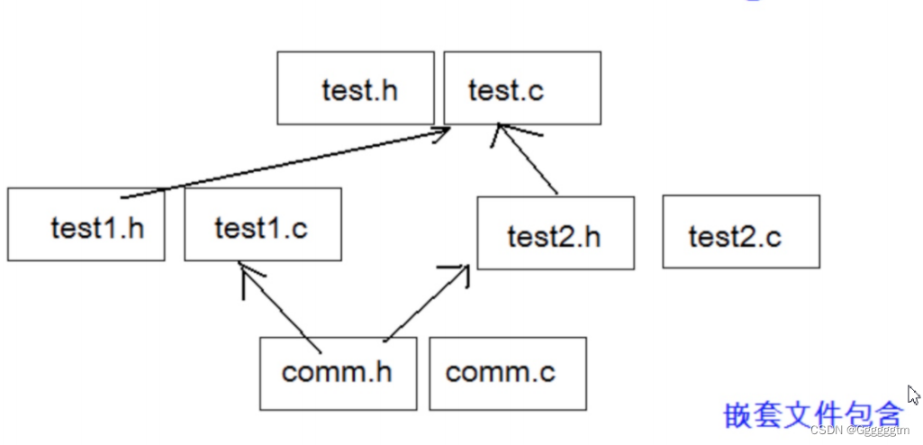 comm.h和comm.c是公共模块。 test1.h和test1.c使用了公共模块。 test2.h和test2.c使用了公共模块。 test.h和test.c使用了test1模块和test2模块。 这样最终程序中就会出现两份comm.h的内容。这样就造成了文件内容的重复。 如何解决这个问题? 答案:条件编译。每个头文件的开头写如下代码即可