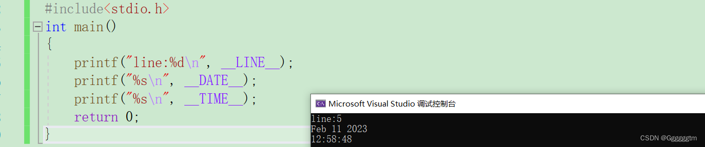 #includeint main() {printf("line:%d\n", __LINE__);printf("%s\n", __DATE__);printf("%s\n", __TIME__);return 0; } 上述代码的运行结果为,如下图: