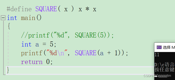 {//printf("%d", SQUARE(5));int a = 5;printf("%d\n", SQUARE(a + 1));return 0;