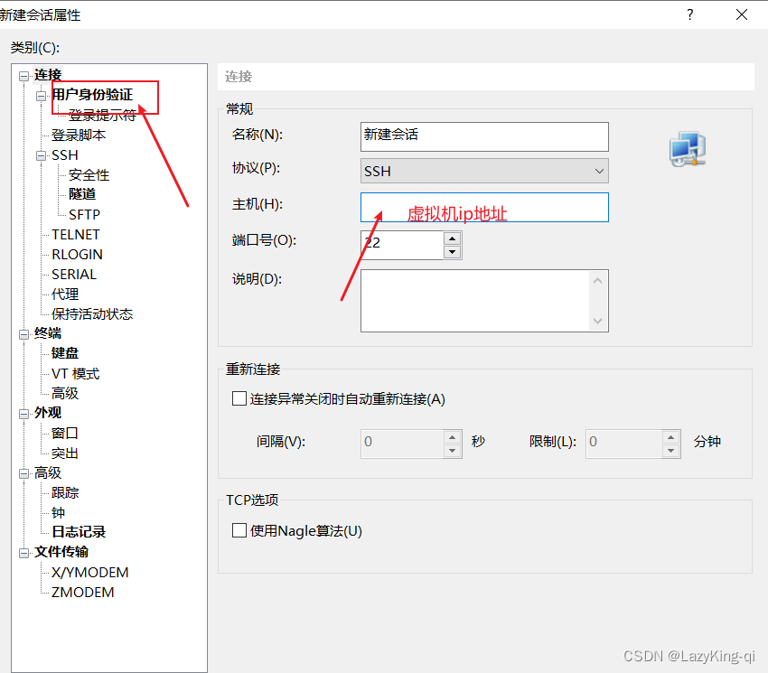 4、输入虚拟机ip地址,点击用户身份验证