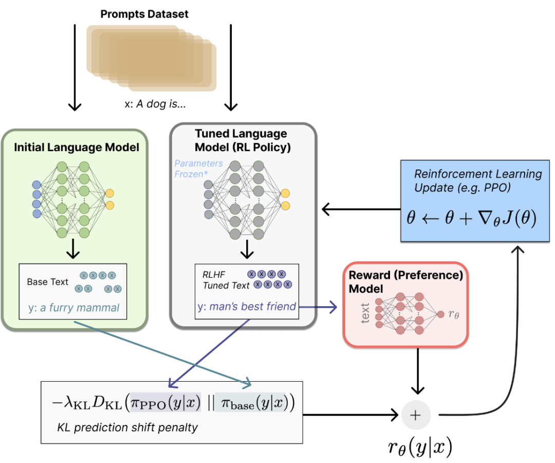 PPO 是一种信赖域优化算法,它使用梯度约束来确保更新步骤不会破坏学习过程的稳定性。在这个阶段继续抽取一批prompt数据之后,使用阶段二构造出来的Reward Model来对微调后的训练模型的回答进行打分来更新预训练的参数。通过Reward Model对产生高分回答进行奖励,由此产生的策略梯度可以更新PPO模型参数。不断循环迭代直至最终收敛模型。