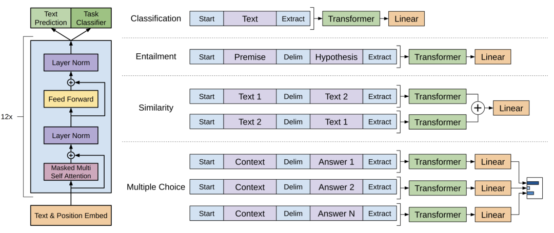 为了提高训练的精准度,很多机器学习的训练任务都是采用标记的dataset来完成,但是实际上标注数据是一个工作量很大的事情会耗费大量的人力和时间。因此随着算力的不断增强,实际上我们需要对更多的未进行人工标记的数据进行训练。因此GPT提出了新的自然语言训练范式就是通过海量的文本数据来进行无监督学习从而能实现模型训练。这也是GPT采用了Pre-training + Fine-tuning的训练模式的原因。GPT的模型结构如下,它的训练目标就是根据上文来预测下文。