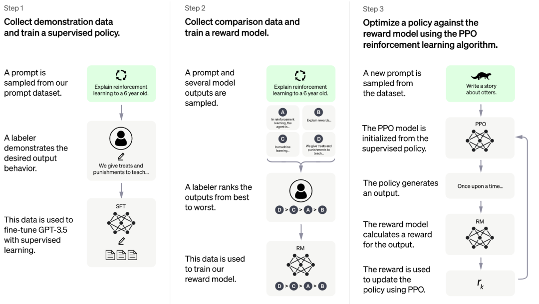可以看的出来实际上ChatGPT训练的过程实际就监督学习结合RLHF技术应用落地的过程,ChatGPT实际上就是靠RLHF技术来实现生成一个比较符合人类预期的回答。