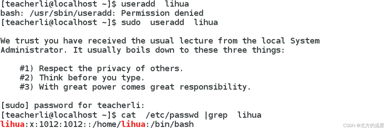 用户teacherli做为一个普通用户账号,是没有权限执行useradd命令向系统添加用户的,但是做为一个sudoer则可以通过使用$sudo useradd lihua然后在系统提示“[sudo] password for teacherli:”时输入teacherli的口令确认后即可。