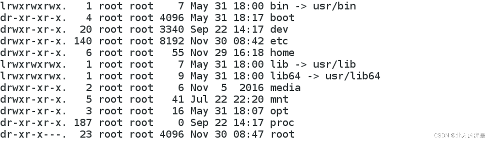 每一行代表对应文件或目录的详细信息。从左到右具体的含义是文件属性、文件数、拥有者、所属的组、文件大小、建立月份、建立日期、建立年份或时间、以及文件名。其中“建立年份或时间”字段,如果文件是今年建立的,则显示具体时间,如果是往年建立的,则显示年份。