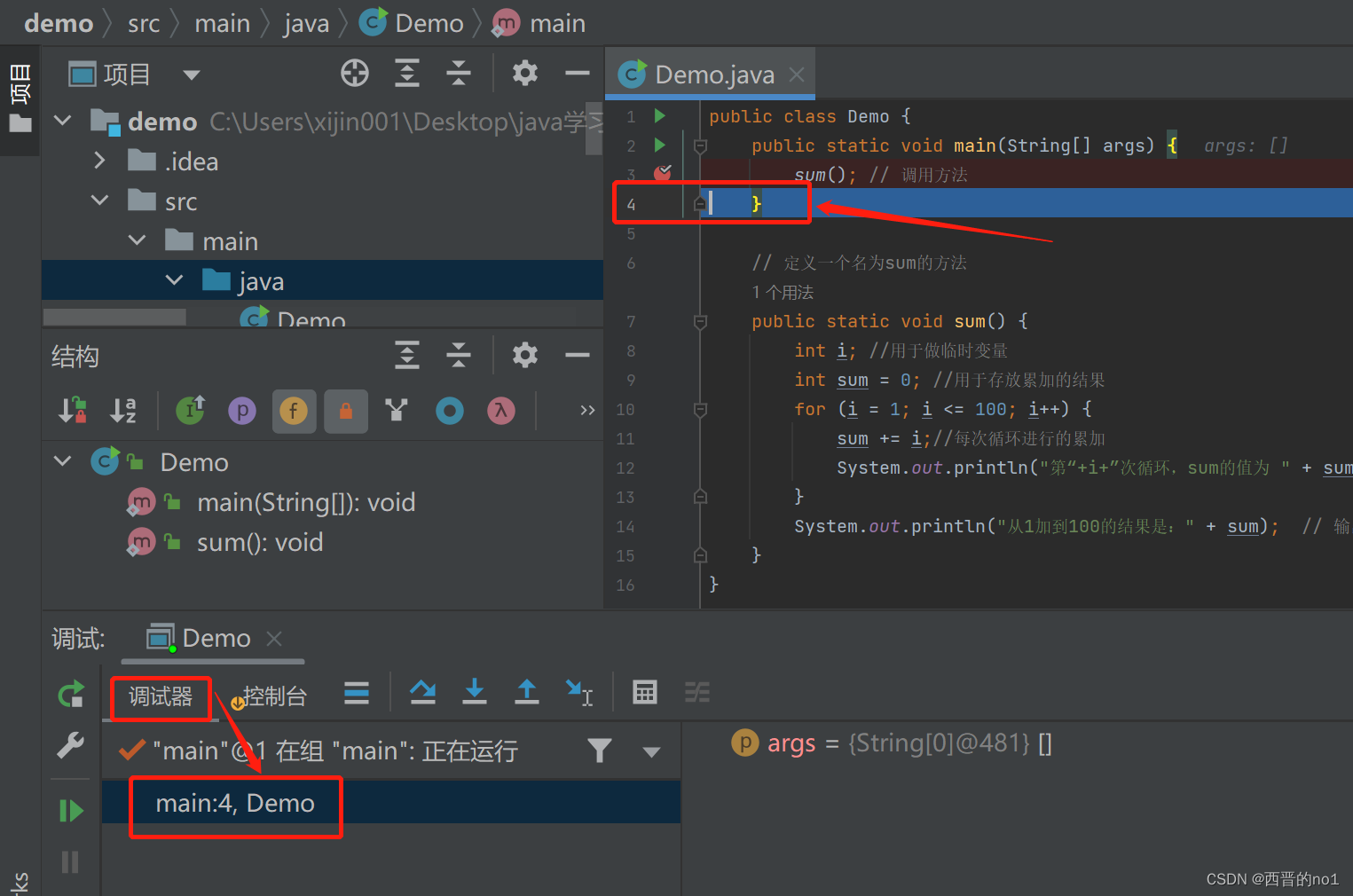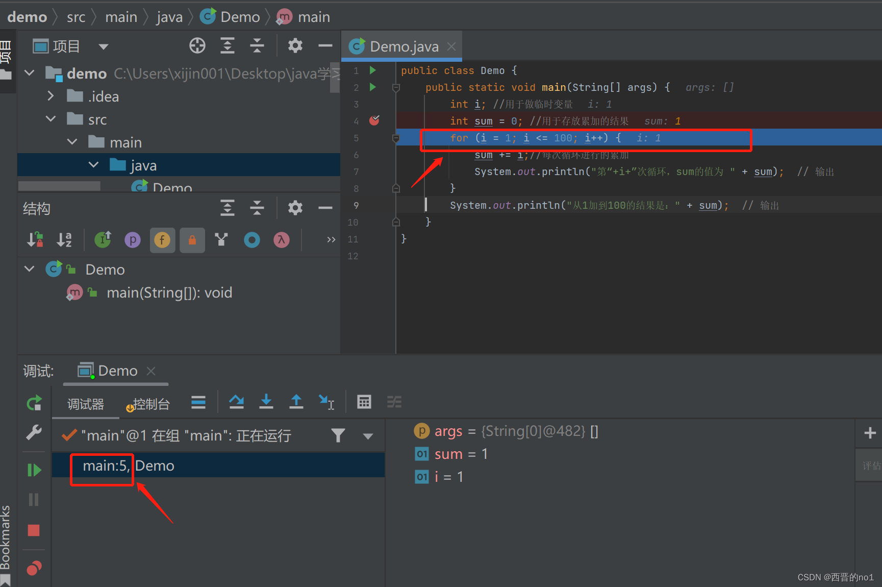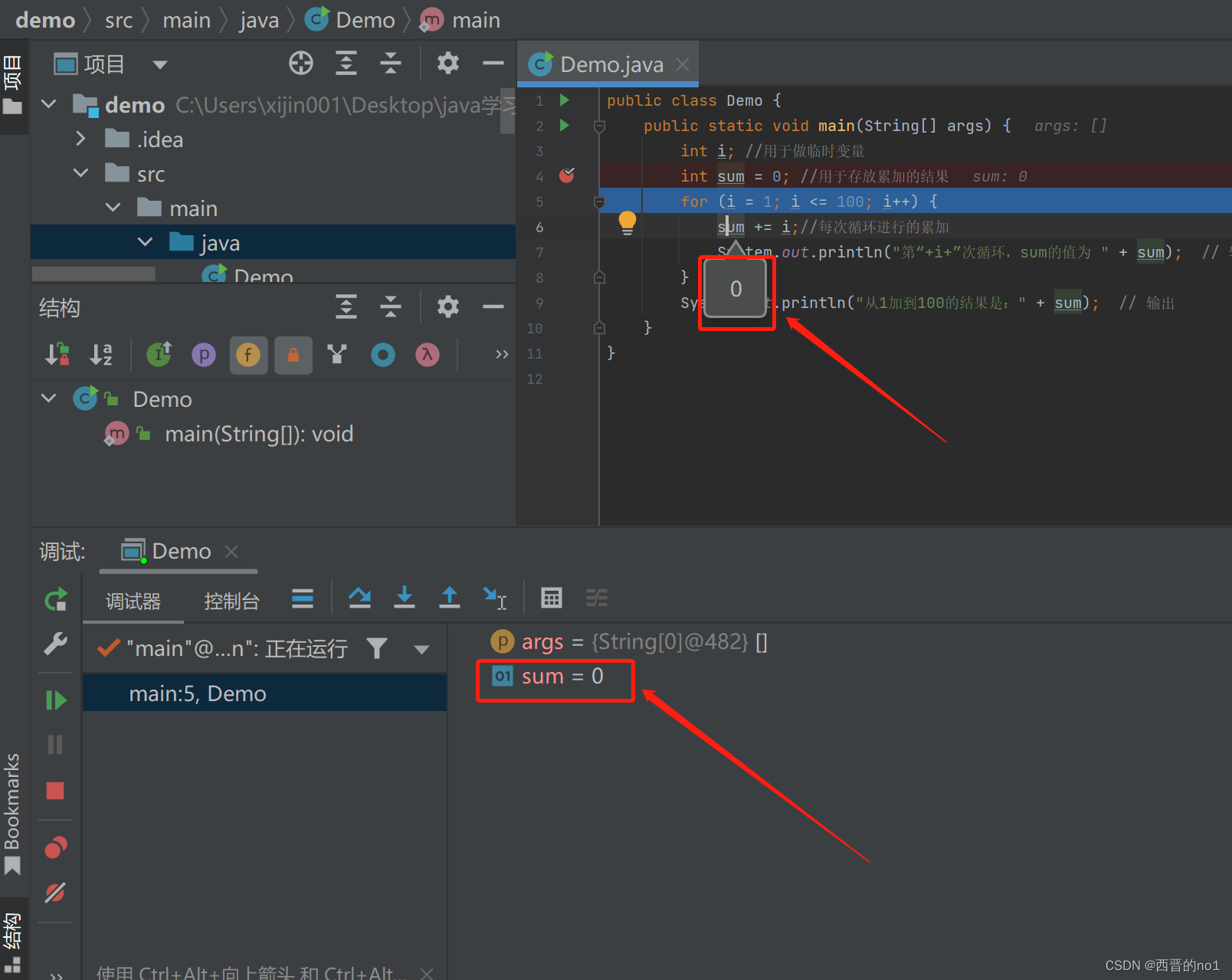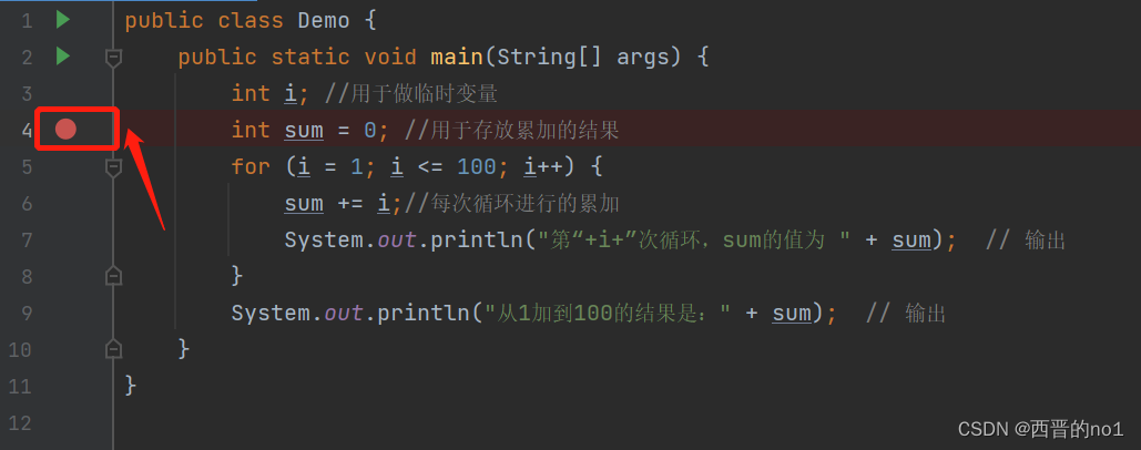 首先本次进行调试的一个程序是实现从1累加到100的功能,是在IDEA下进行编写的。如图所示: