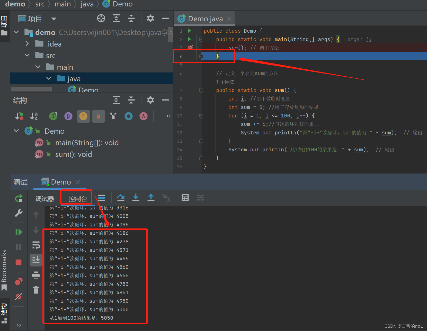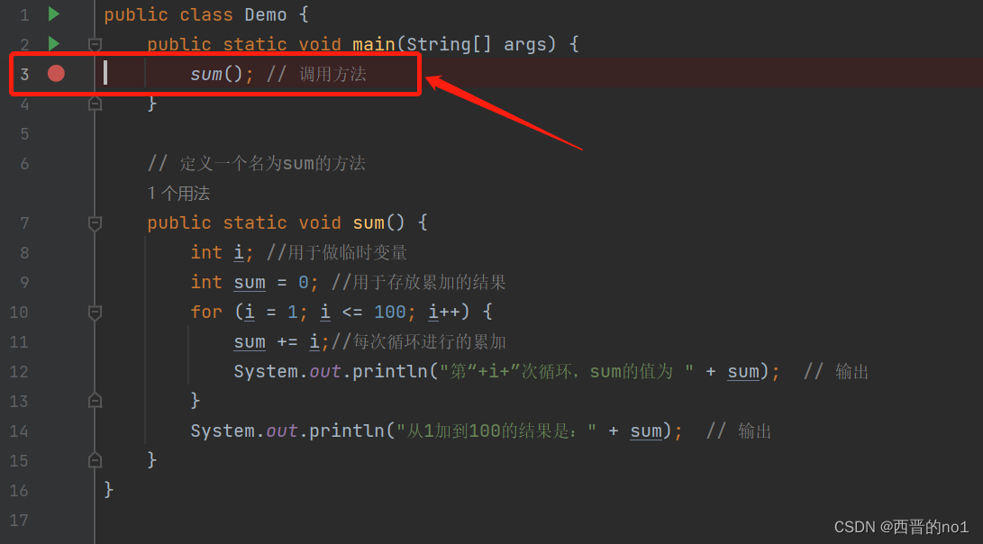 public class Demo {public static void main(String[] args) {sum(); // 调用方法}// 定义一个名为sum的方法public static void sum() {int i; //用于做临时变量int sum = 0; //用于存放累加的结果for (i = 1; i <= 100; i++) {sum += i;//每次循环进行的累加System.out.println("第“+i+”次循环,sum的值为 " + sum); // 输出}System.out.println("从1加到100的结果是:" + sum); // 输出}
