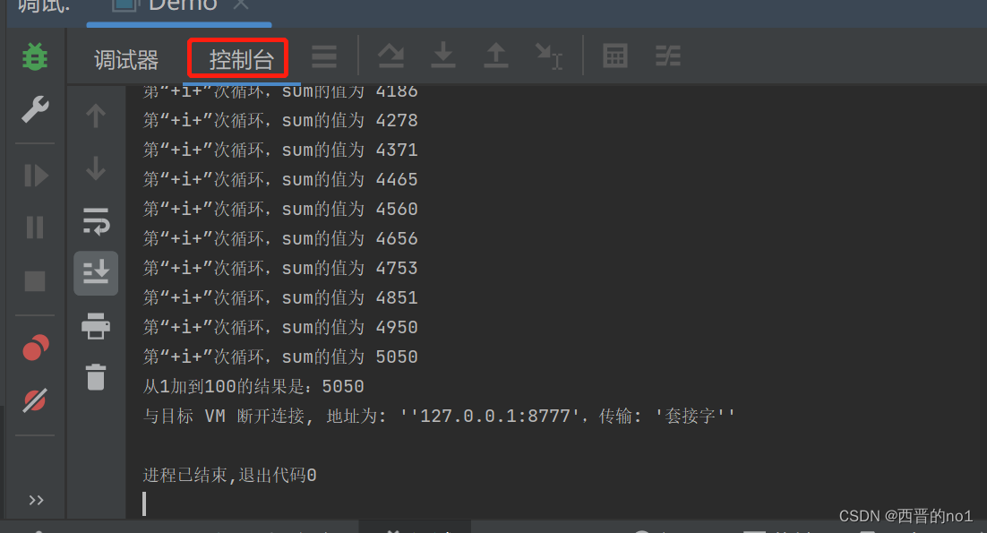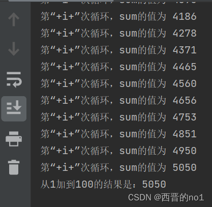// System.out.println("第“+i+”次循环,sum的值为 " + sum); // 输出语句取消掉注释之后再运行一次得到的结果如图所示: