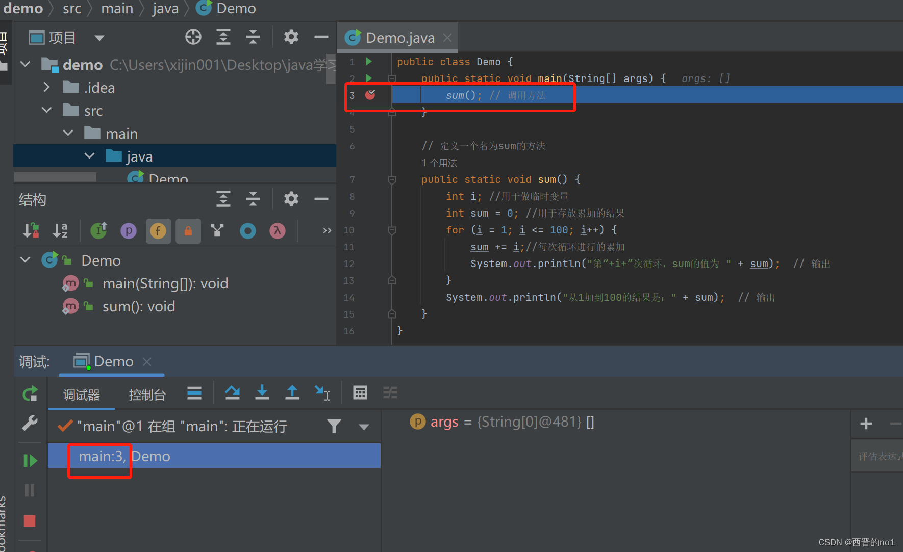 }将上述代码放入idea中,同时在第3行打一个断点,结果如图所示:
