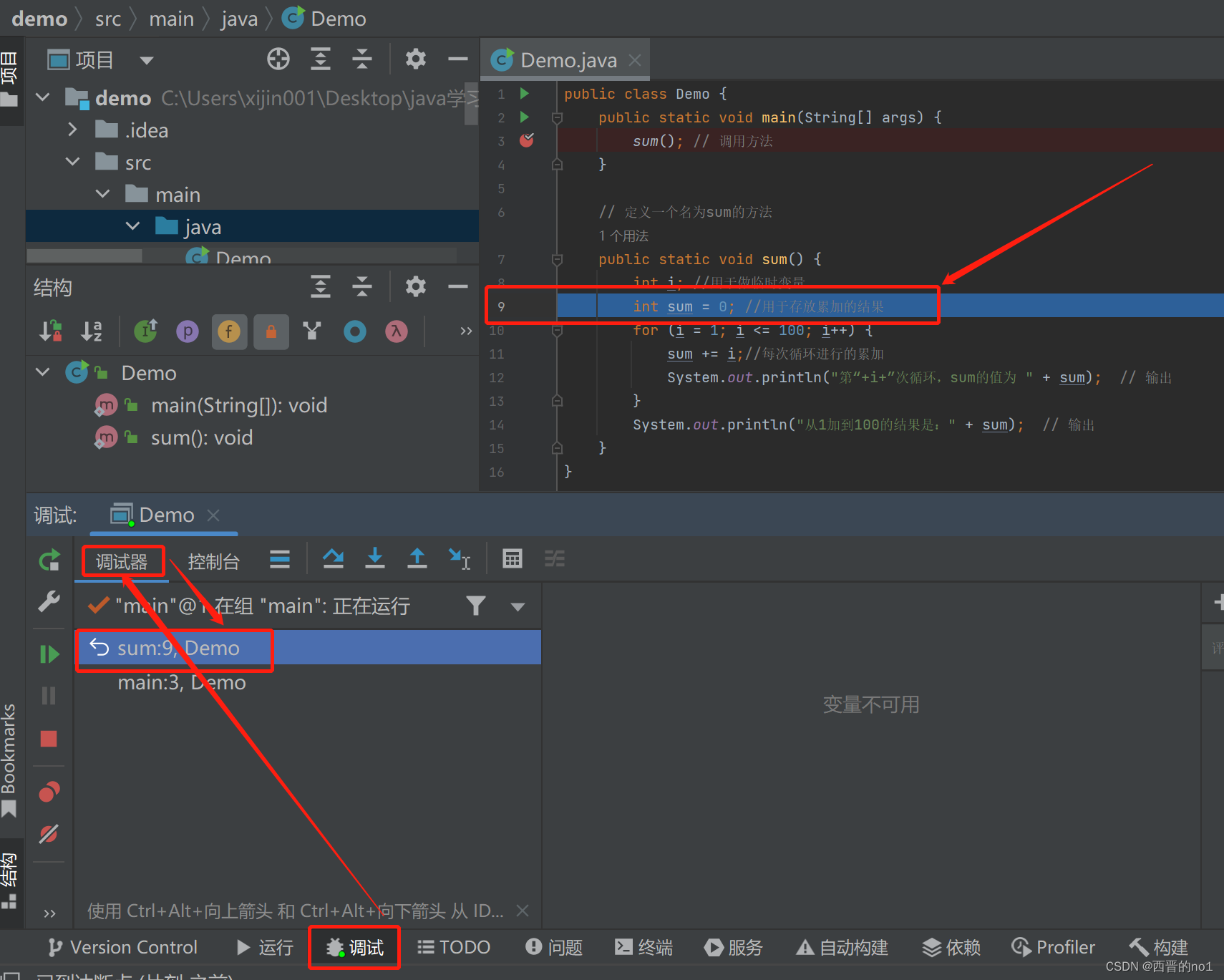 可以看到左下角的Debug框中也表示了进入到sum方法,运行到第9行。接下来继续点击