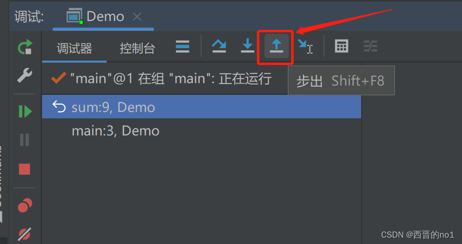 (快捷键shift+F8):表示的是步出,从方法内部回到方法的调用处