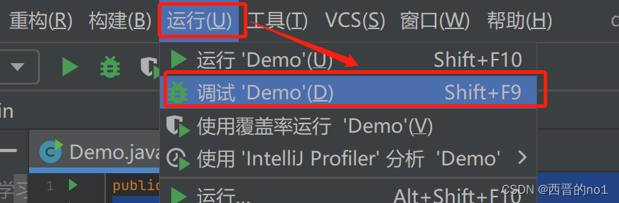 菜单栏依次点击 运行 -> 调试 ...,如下图