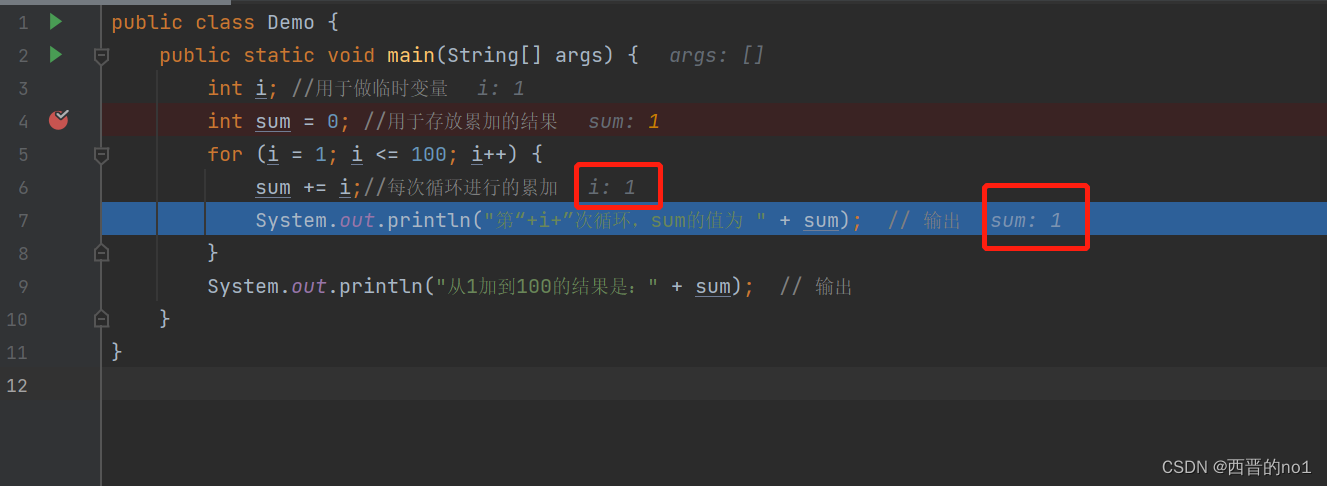 // System.out.println("第“+i+”次循环,sum的值为 " + sum); // 输出}System.out.println("从1加到100的结果是:" + sum); // 输出}