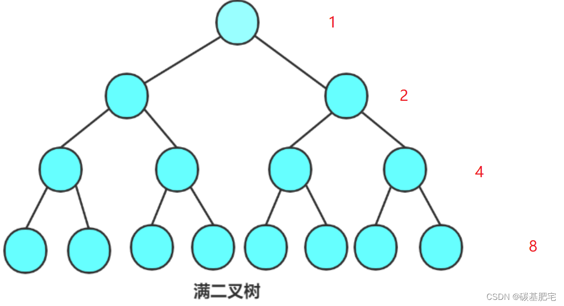 2. 若规定根结点的层数为1,则一棵非空二叉树的第i层上最多有 2^(i-1) (i>0)个结点。推导:当第i层满的时候,就是该层节点数最多的时候。如下图的完全二叉树,第一层最多1个节点,第二层最多2个节点,第三层最多4个节点,第四层最多8个节点……可以归纳出规律:第i层最多2^(i-1)个节点。